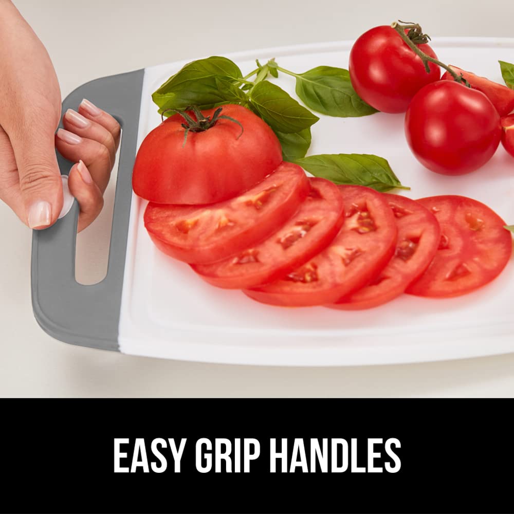 TOUGH GRIP: cutting boards for kitchen designed with slip resistant handle and rubber border, secure grip helps reduce sliding on countertops, better stability to make kitchen cooking prep easier