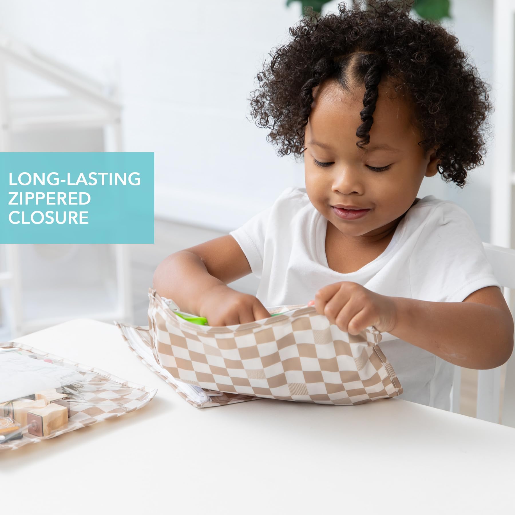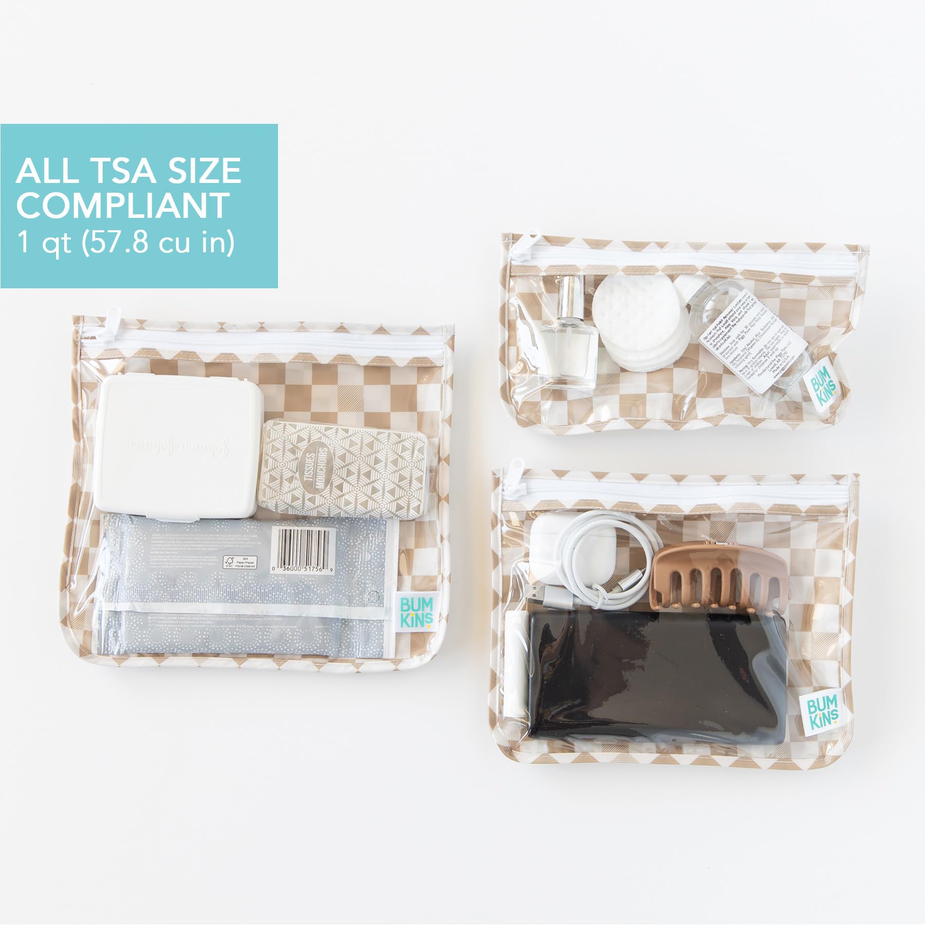 A smart alternative to single-use plastic bags to keep things organized, our clear-sided 3-pack reusable travel pouches are TSA compliant, making it easy to go from your day-to-day and then through security. Not just for airplane travel – these travel bags make excellent organizers for toys, accessories, cosmetics, electronics, and more. Pack and stash inside your purse, travel bag, diaper bag, tote bag or backpack. The bags are lightweight and lay flat, so when traveling they take up less space when empty than other containers and cubes. With a strong and durable zipper closure, our bags keep your items secure. Bumkins uses third party labs to ensure the products we manufacture comply with CPSC and CPSIA standards for BPA, Lead, and Phthalates. The set includes 3 sizes: large: 9.5in x 8.5in; medium: 9in x 7in; small: 9in x 5in. Meets TSA requirement for size limit of 1 quart-sized bag (57.8 cubic inches). For over 30 years, Bumkins has been creating thoughtful and responsibly made essentials for babies and kids, making parenting easier so families can cherish those special moments. Designed in Arizona, responsibly made in China.