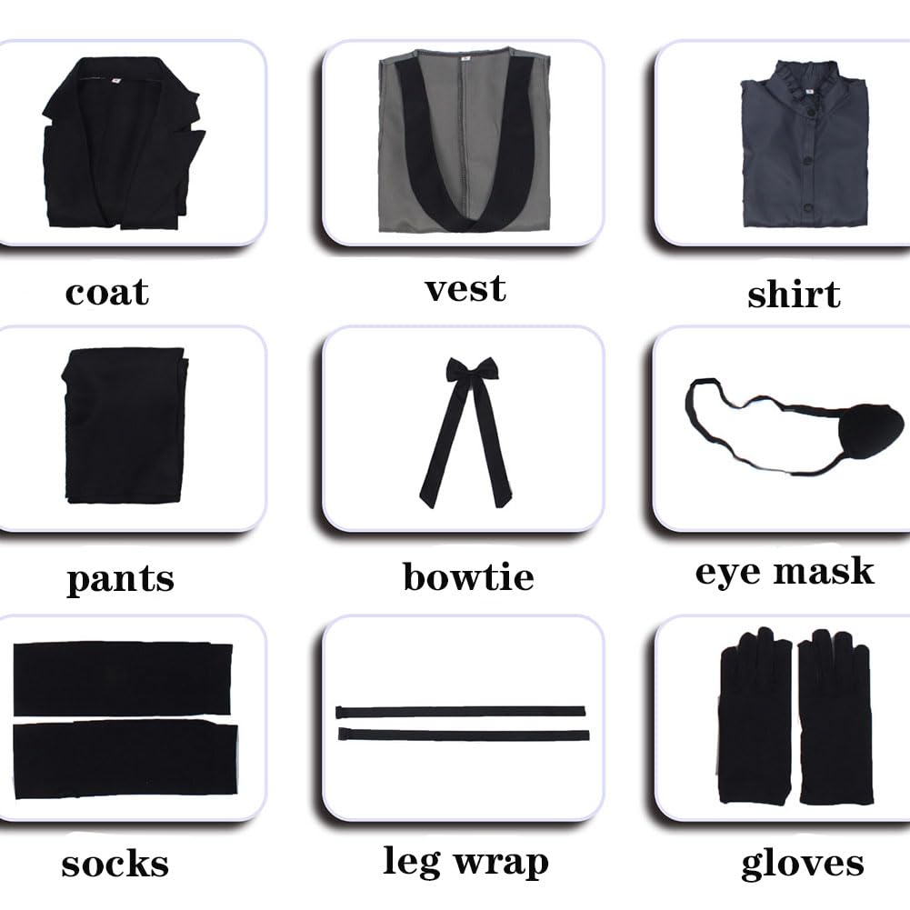 Package includes:Coat,vest,shirt,pants,bowtie,eye mask,socks,leg wrap,gloves