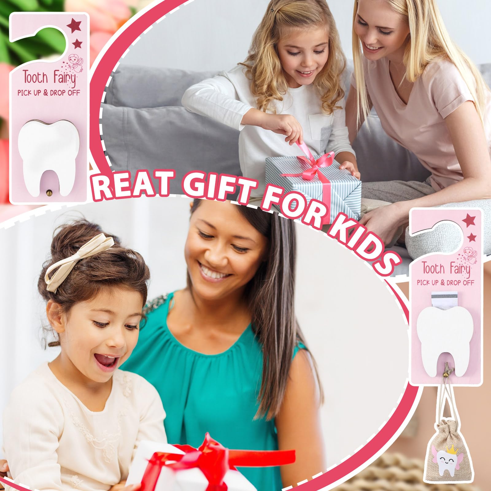 Package Contents: our tooth holder for kids teeth includes 1 tooth fairy door hanger, 1 burlap pouch, and 1 clear bottle; These items together provide a comprehensive solution to the delightful ritual of losing baby teeth, setting the stage for a childhood filled with memories