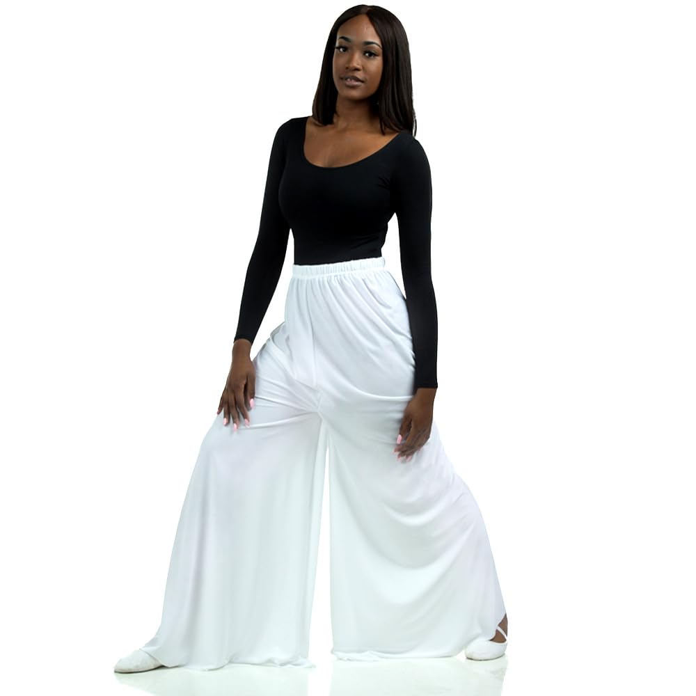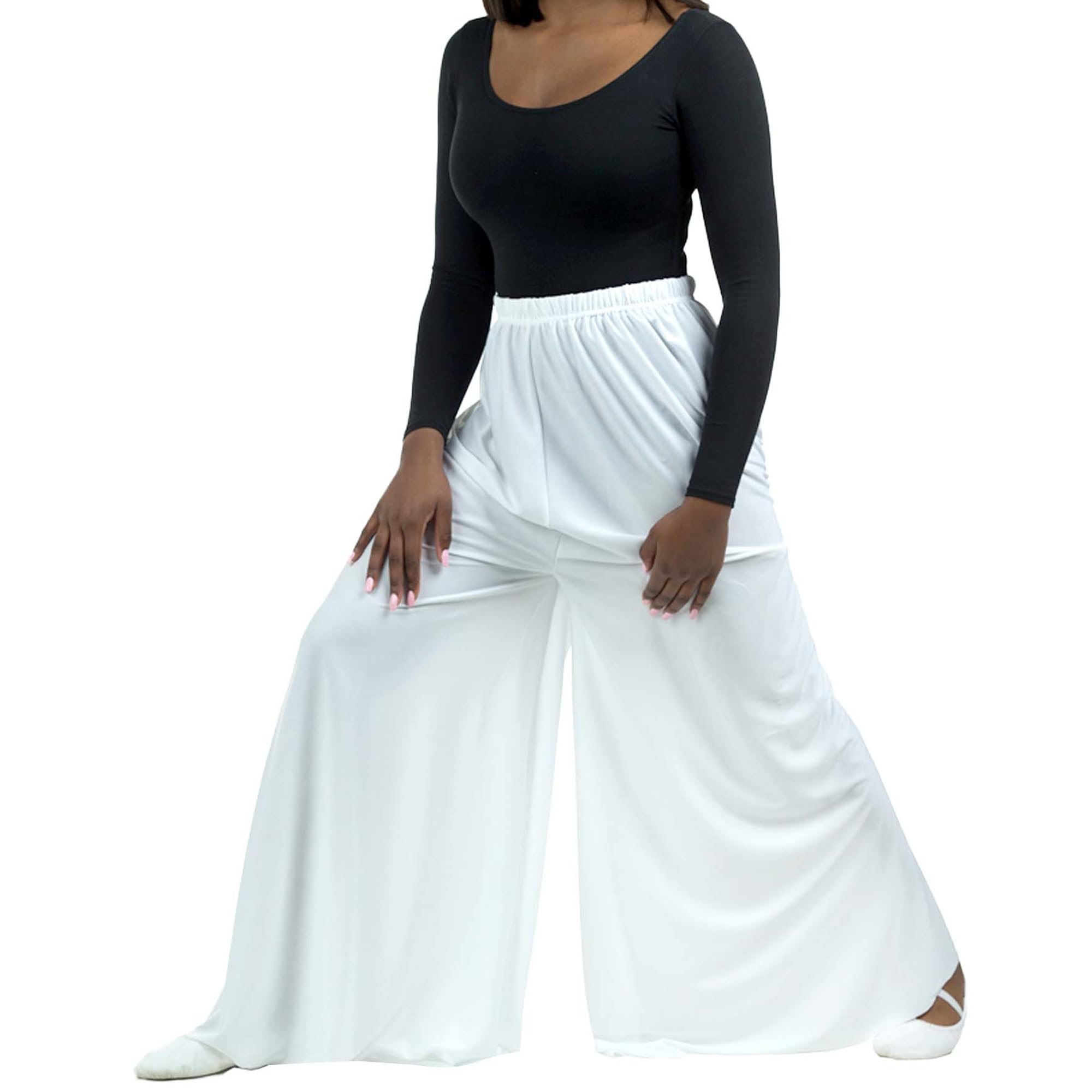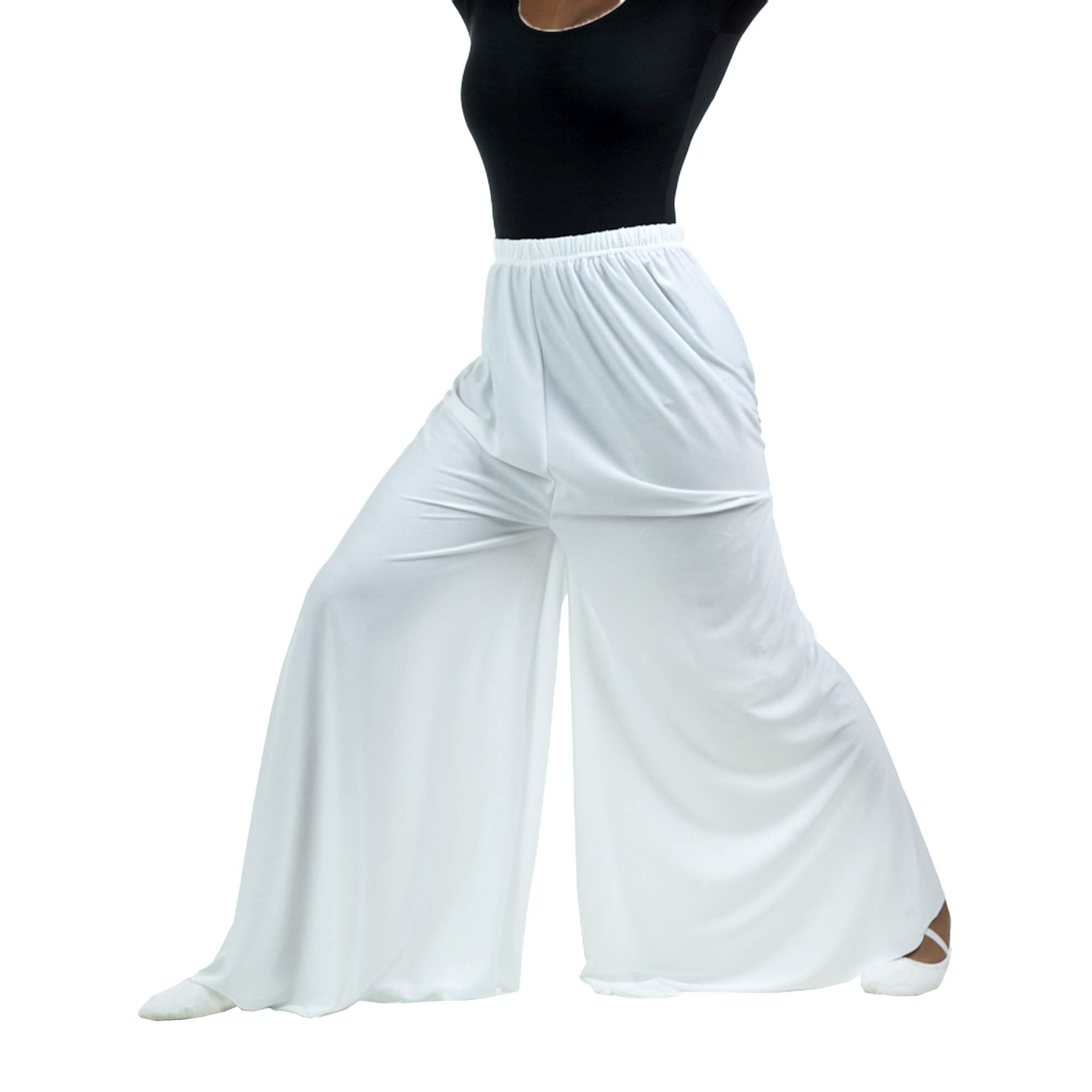 Description Palazzo pant is designed for dancers that perform spiritual or liturgical dancing. This pant features a loose and extra wide leg fit. The polyester/spandex fabric is smooth, soft, and moves easily when dancing. The elastic waistband design provides a comfortable fit and easy changing for performances. The palazzo pants are made in full length in order to fit the majority. But no need to worry about them being too long. You can easily cut to your size in length without a need for a hem as the material does not unravel or fray.