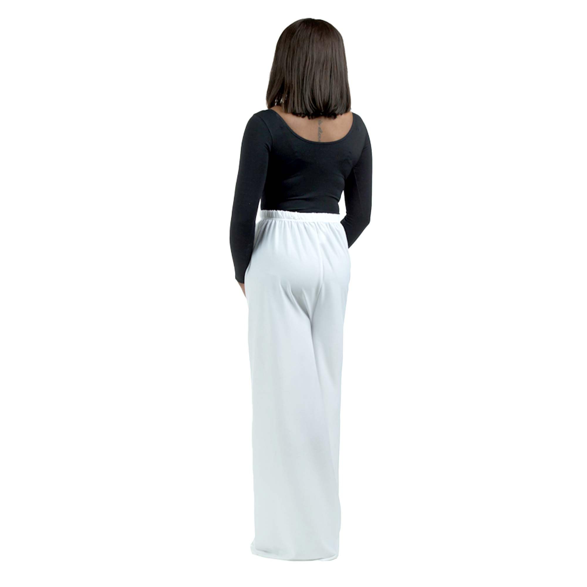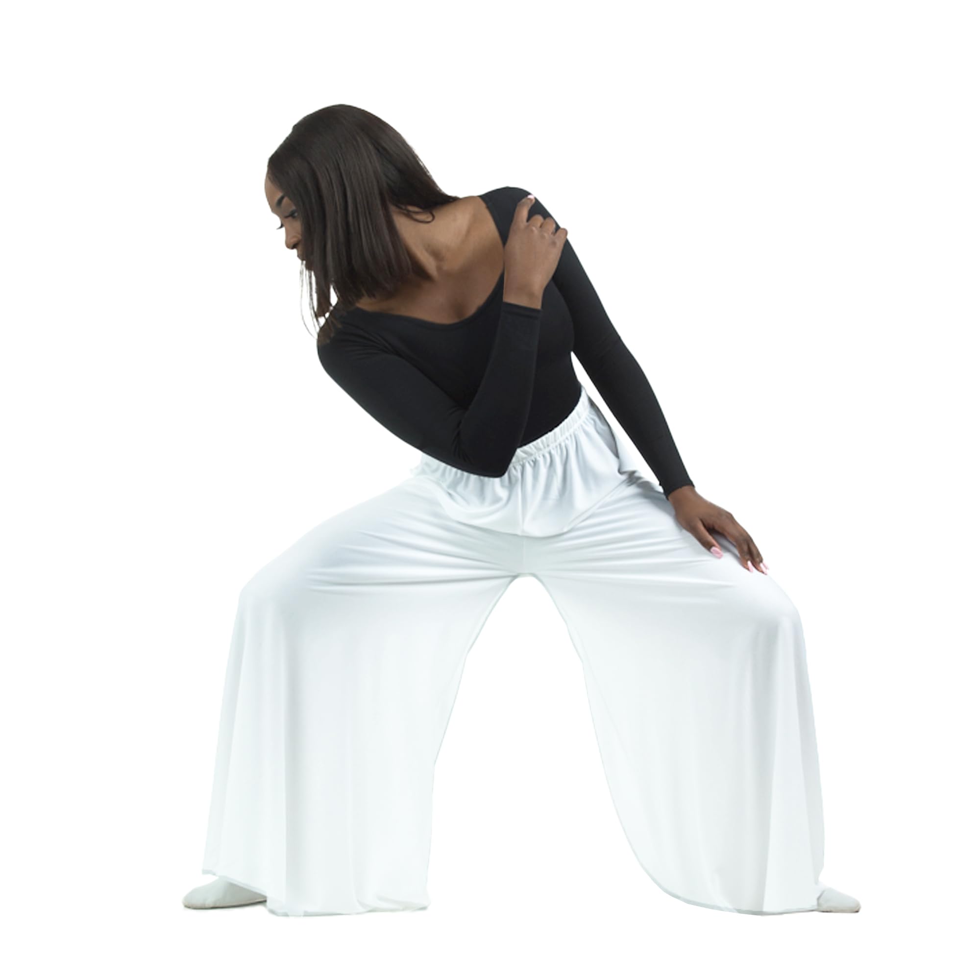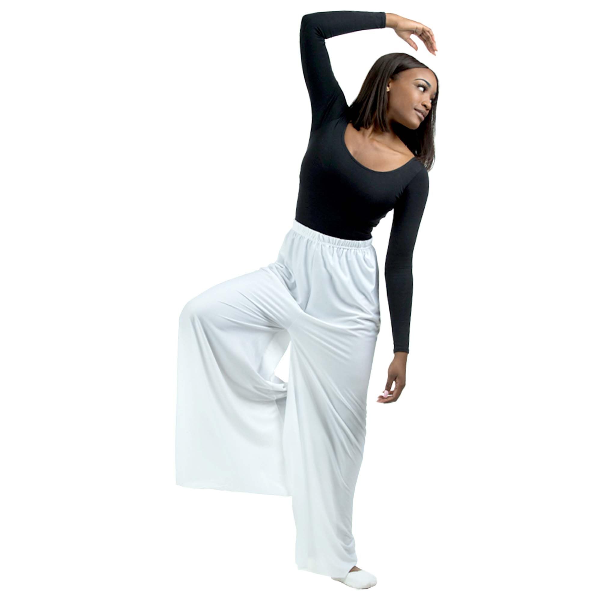 Description Palazzo pant is designed for dancers that perform spiritual or liturgical dancing. This pant features a loose and extra wide leg fit. The polyester/spandex fabric is smooth, soft, and moves easily when dancing. The elastic waistband design provides a comfortable fit and easy changing for performances. The palazzo pants are made in full length in order to fit the majority. But no need to worry about them being too long. You can easily cut to your size in length without a need for a hem as the material does not unravel or fray.