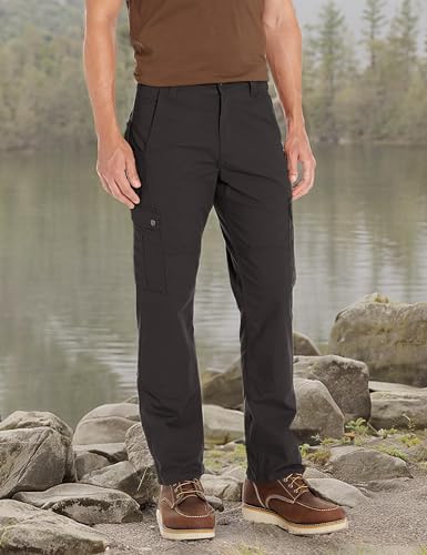 Description Built to move, these men's Carhartt cargo work pants offer job-site durability with stretch for easy mobility. Large thigh pockets plus utility pockets offer plenty of storage space. High-wear pocket areas are reinforced with Cordura®, and double-front legs accept knee pads. Their relaxed fit offers a little extra room through the seat and thigh with a straight leg opening.