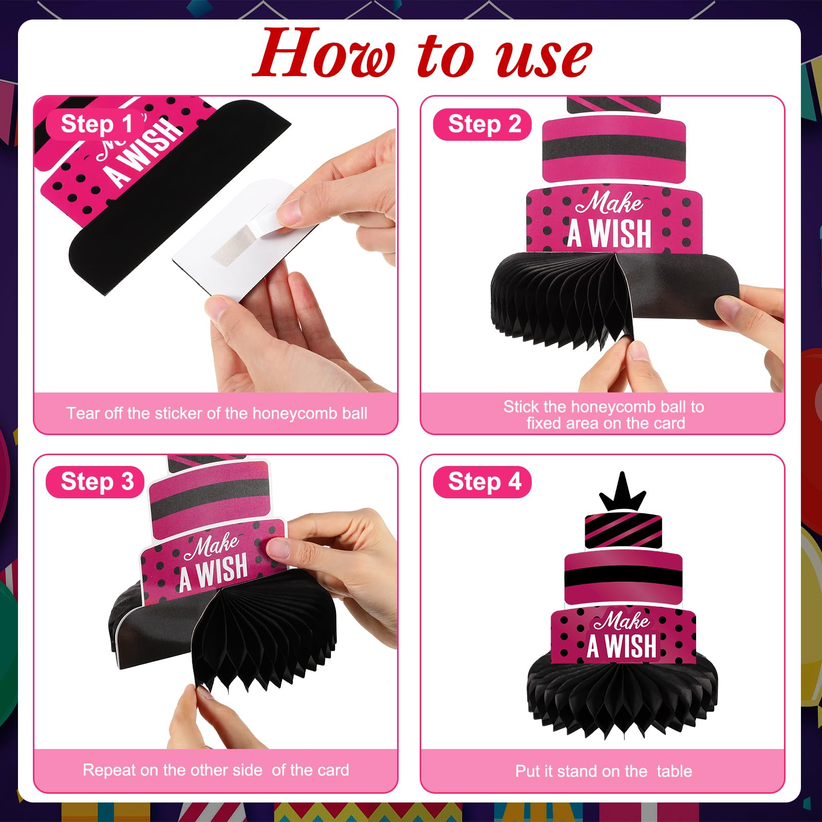Easy to Assemble: our pink birthday table centerpiece decorations are reserved with stickers, you only need to tear off the honeycomb sticker, paste the honeycomb ball to the bottom of the card and fix it, and finally gently unfold the honeycomb ball by hand, which can complete the assembly, simple and convenient