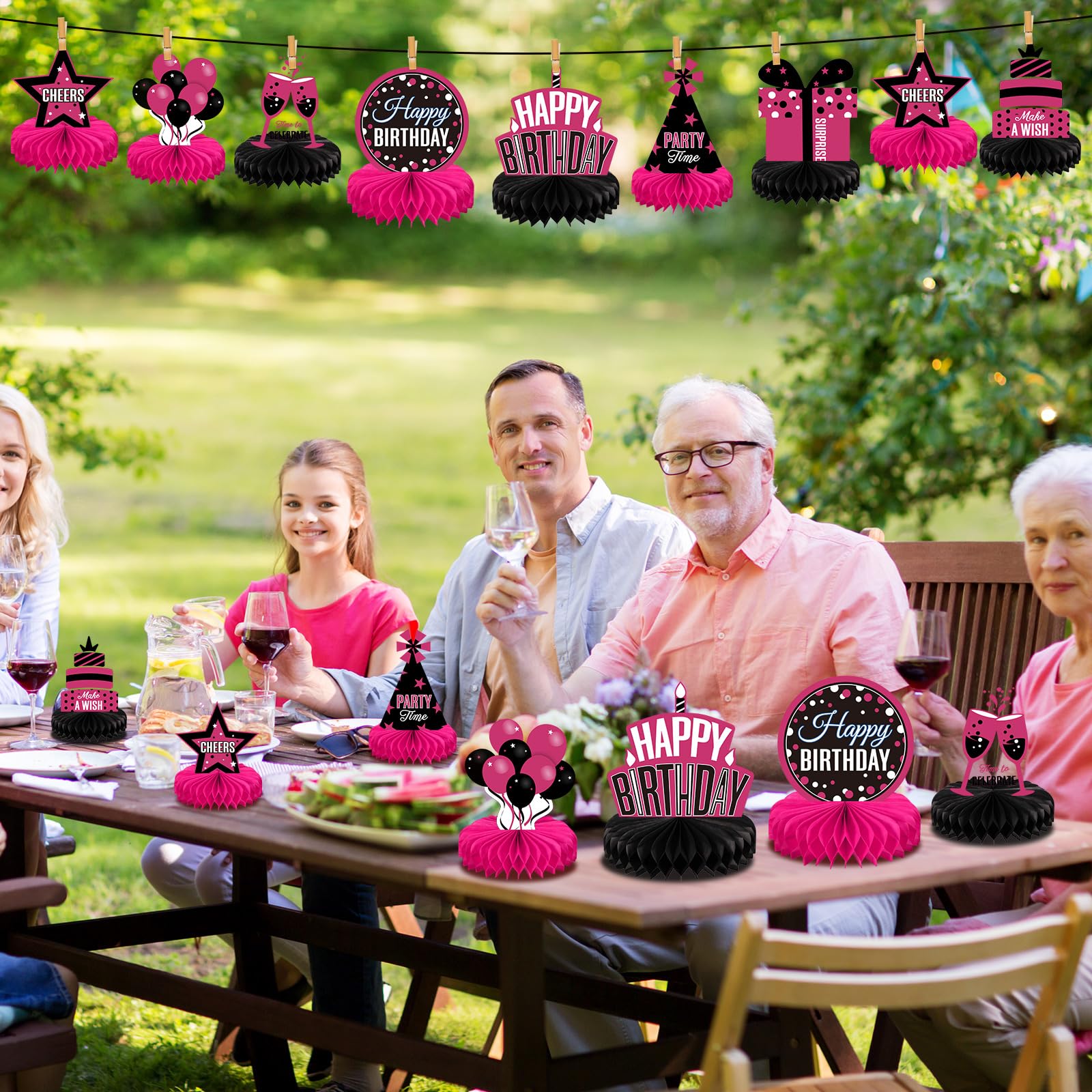 Exquisite Design: distinctive pink and black birthday honeycomb table decorations feature delicate and diverse pattern designs, including cakes, balloons, stars, gift boxes, etc., will make your birthday party more different