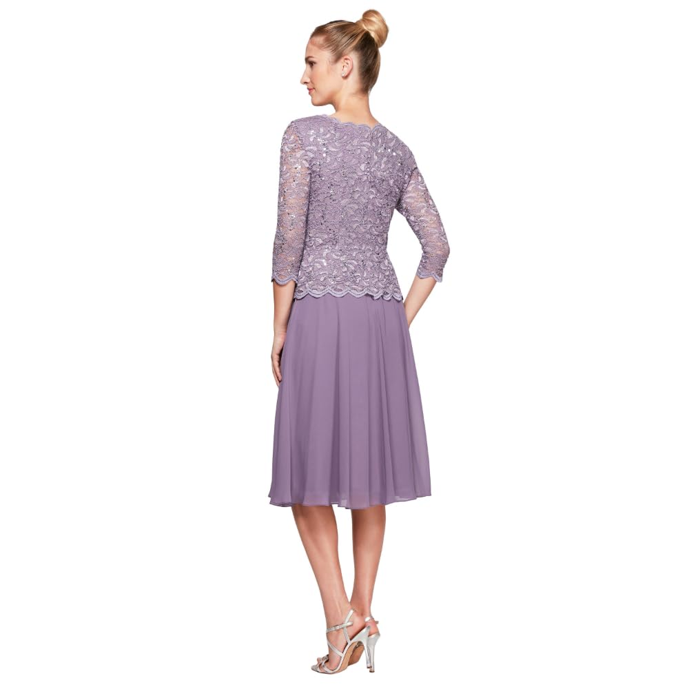 Description Our tea-length mock 2-piece cocktail dress is the picture of elegance with sheer lace sleeves, silky chiffon skirt & scalloped lace edges. Perfect for Mother-of-the-Brides (& Grooms)! Hand wash in cold water Lay flat to dry Items must be unworn, unwashed and undamaged, with all tags attached Final sale items cannot be returned Items sent back without authorization, or an Alex Evenings return label, may not be eligible for refunds