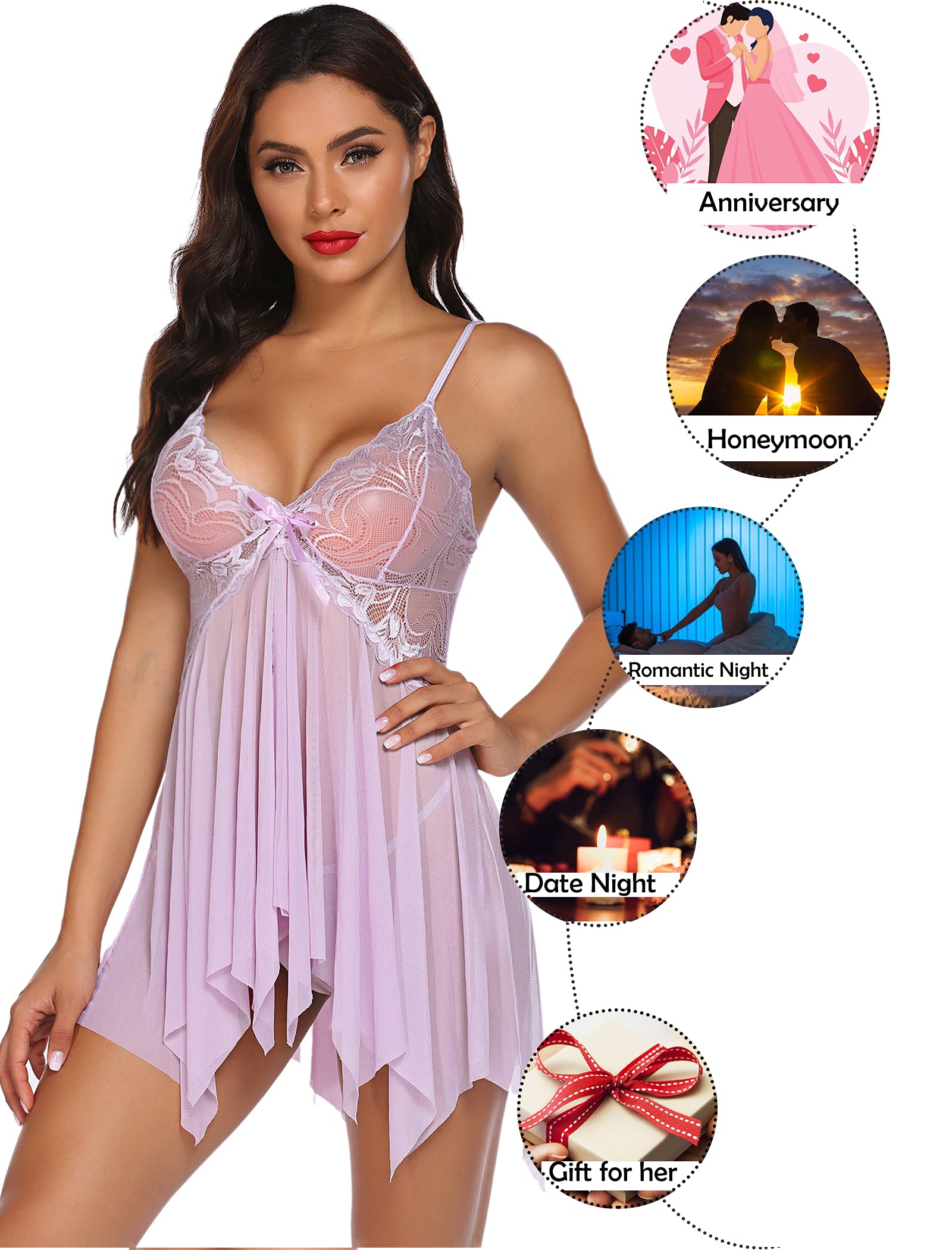 lingerie for women/lace lingerie for women/womens lingerie sexy/baby doll lingerie for women which feature floral lace cups with cute bow decor, adjustable shoulder straps, flowing asymmetrical hem, and matched sheer G-string, sexy and elegant
