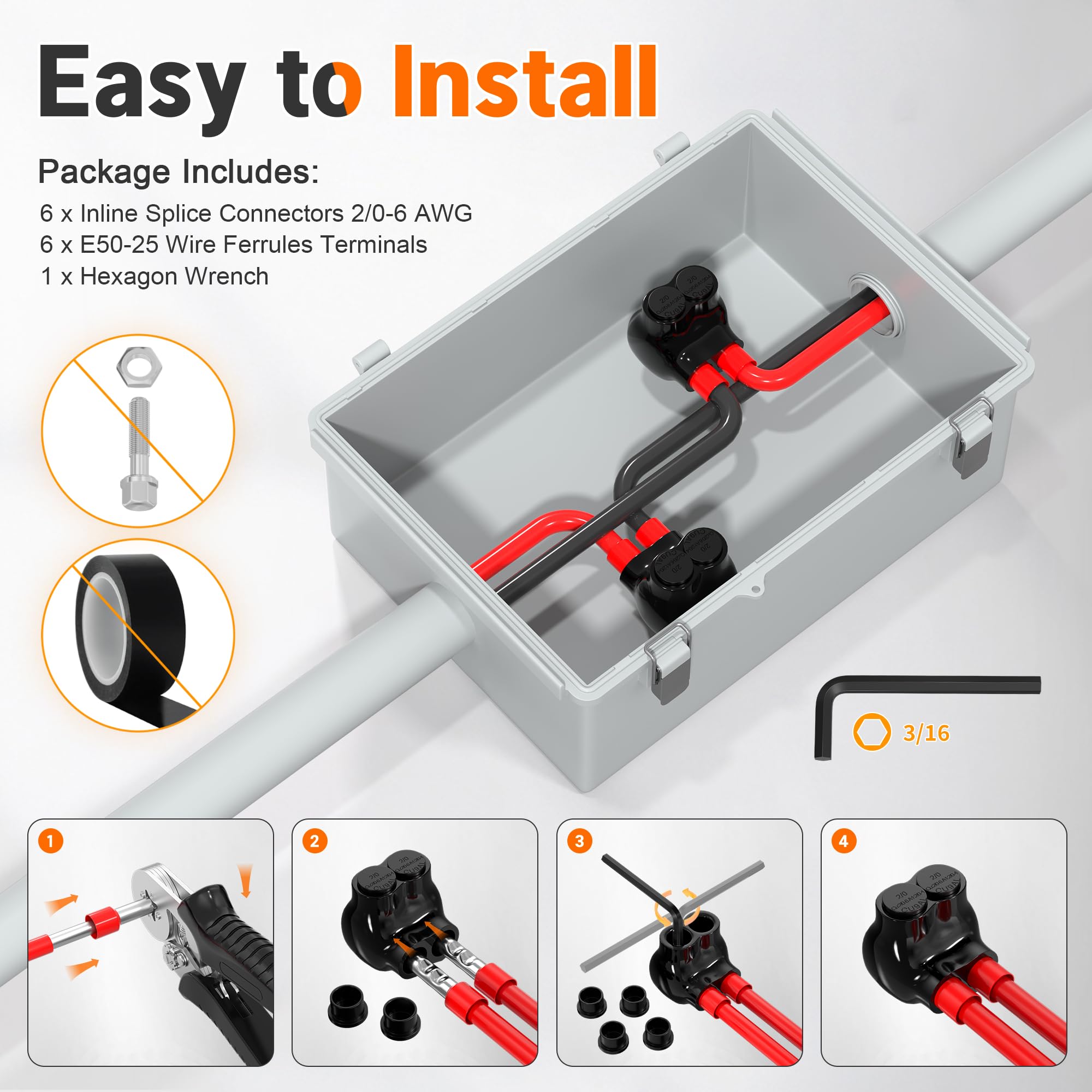 Package Includes: Our package includes 6 x insulated inline splice connector 2/0-6 gauge wire connectors, 1 x hexagon wrench, and 6 x E50-25 wire ferrules terminals. It will come with all necessary accessories for convenient use. It can be used for a wide range of electrical applications, including cable trays, panel boards, solar wiring, ducts, raceways or troughs to ensure the normal operation of electrical systems