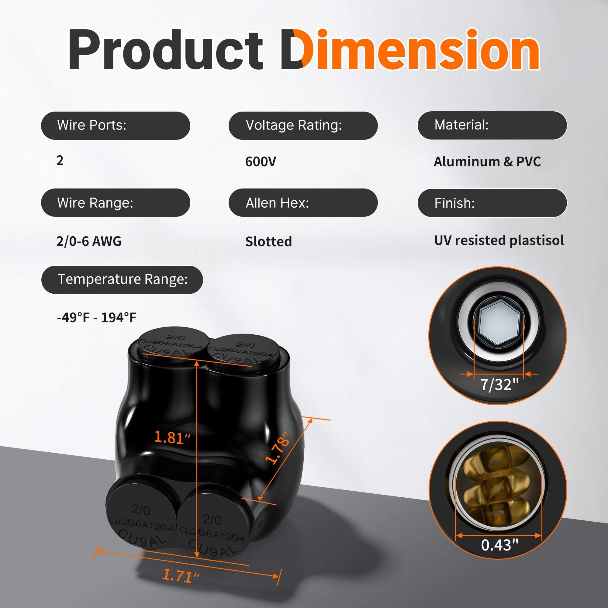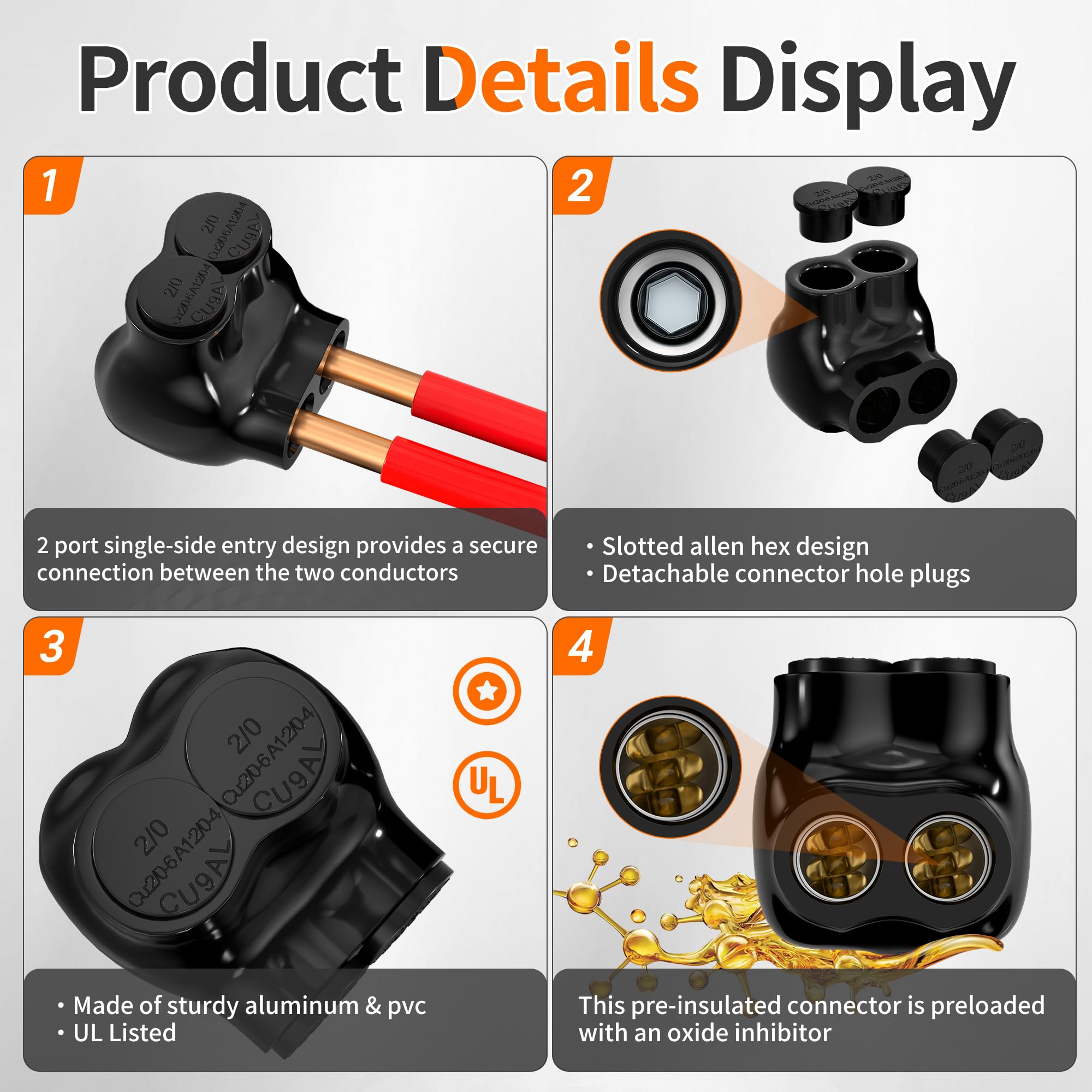 Heavy Duty: The 2 port aluminum wire connector is designed for 6 AWG, 4 AWG, 2 AWG, 1-1/0 AWG, 2/0 AWG wires, which makes it can handle wider range of wire cables
