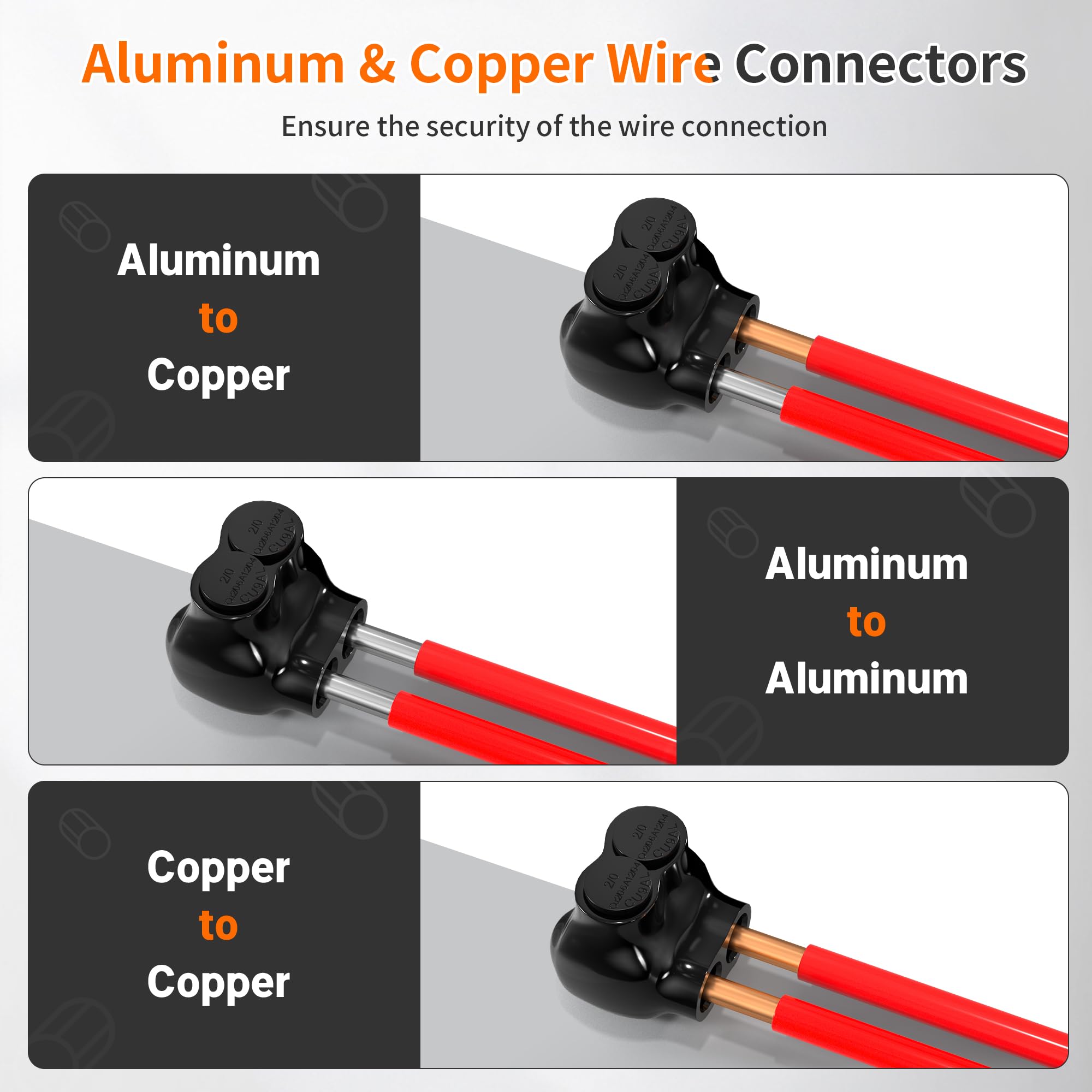 Aluminum&Copper Wire Connection: The insulated aluminum wire connector allows the copper wire to copper wire, aluminum wire to aluminum wire, and copper wire to aluminum wire connection, which enabled the copper and aluminum wire to be safely stitched together. It is more secure and reliable for your wiring
