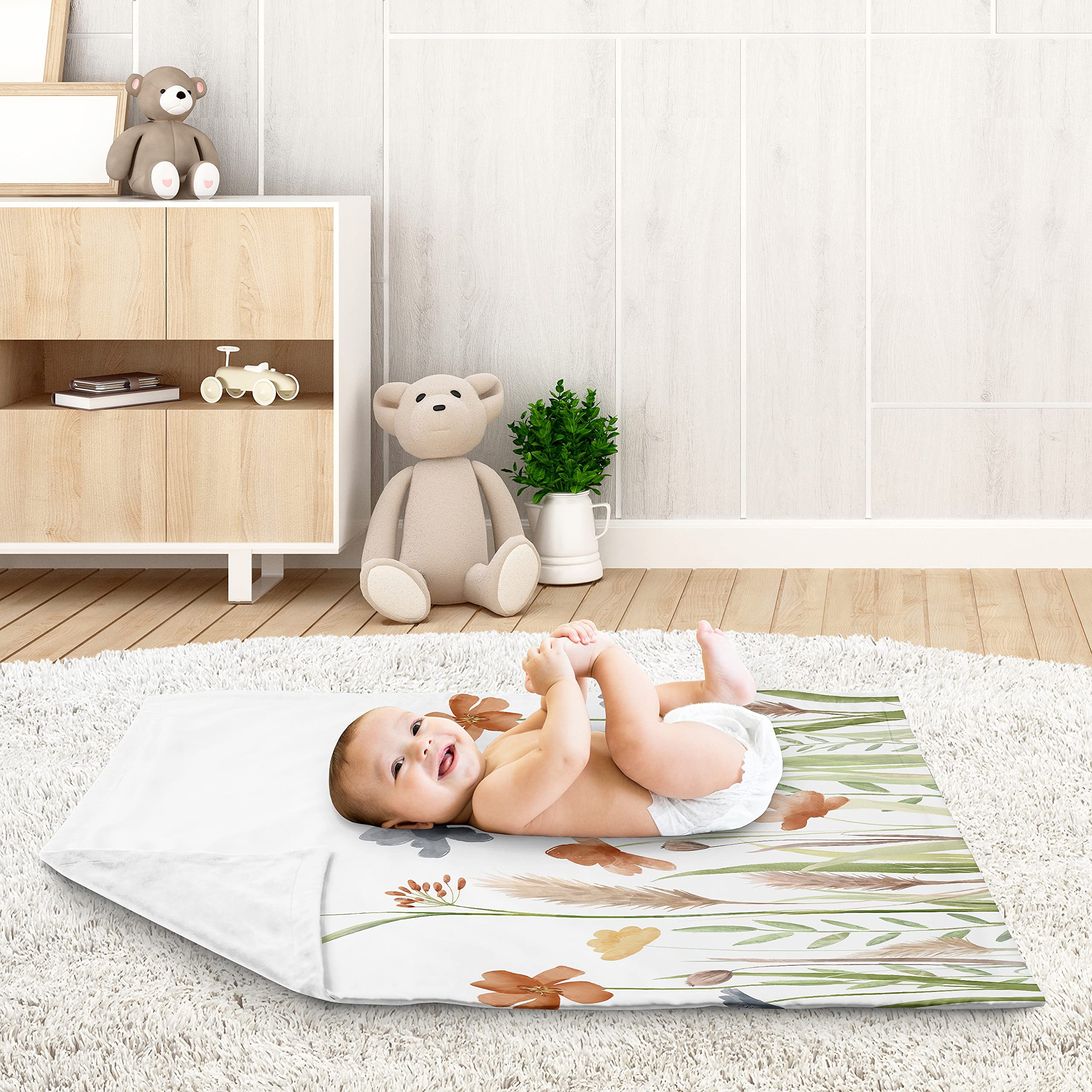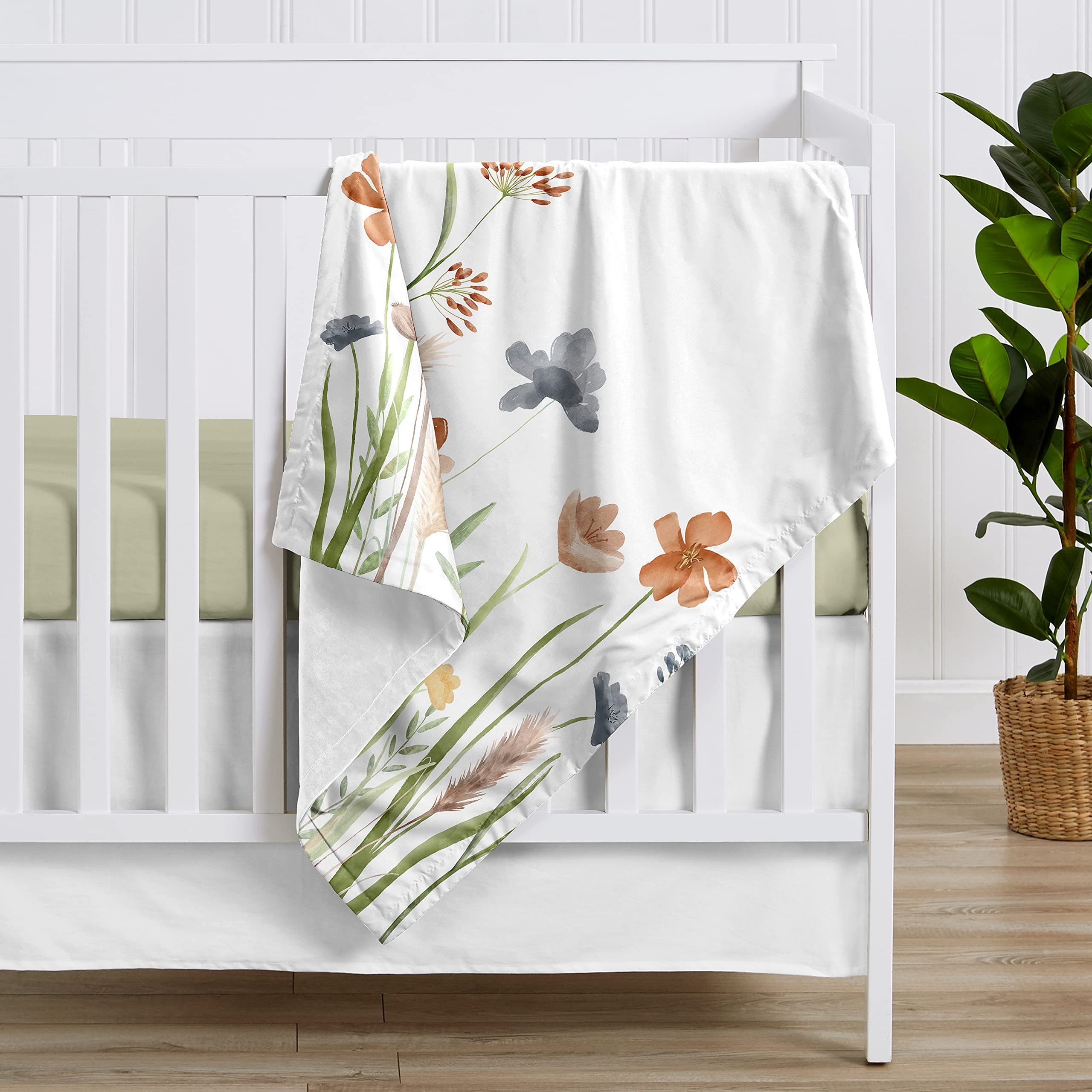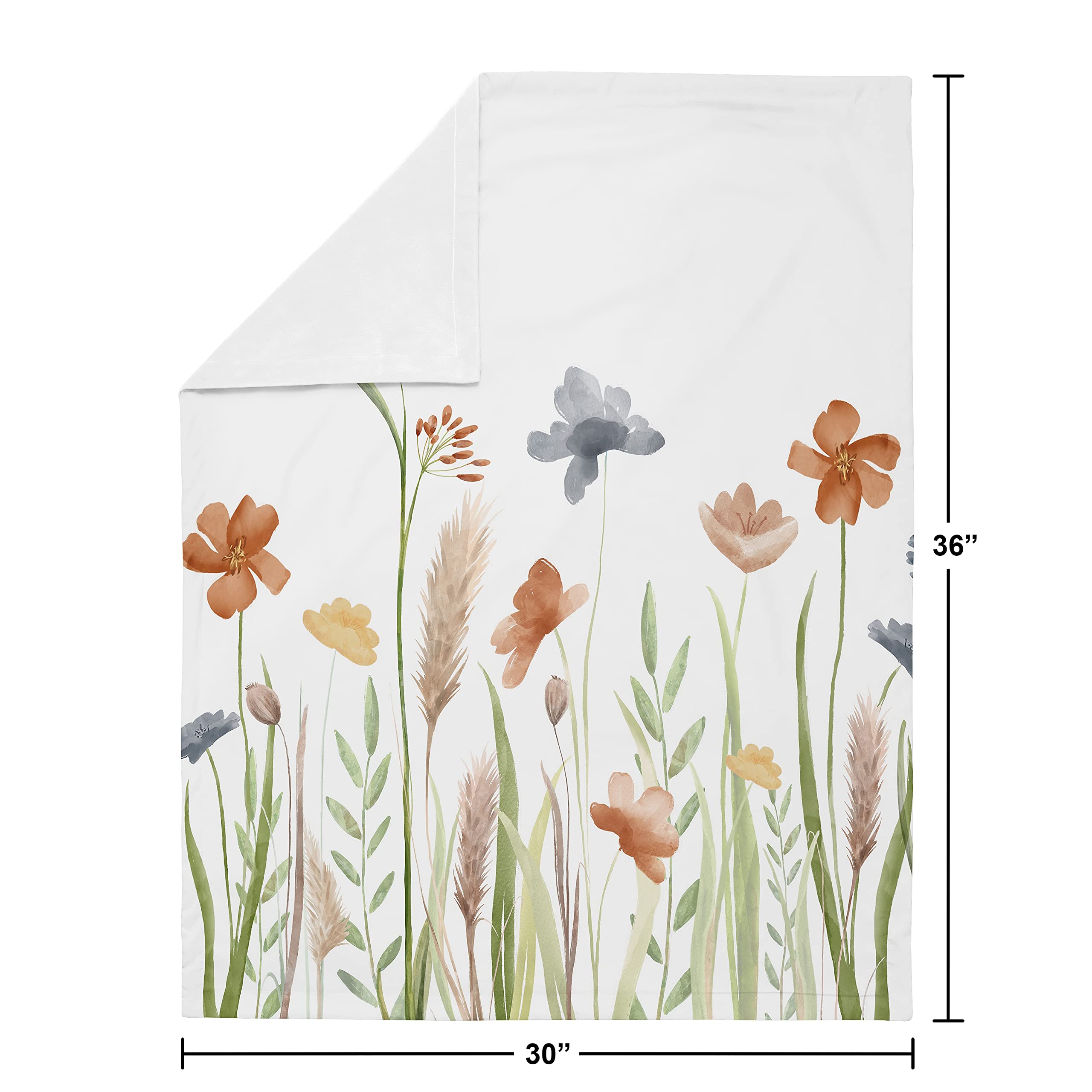 Blanket is designed using a solid sage green, beige, blue, rust orange and taupe boho floral garden watercolor flower wildflower brushed microfiber print and reverses to soft white minky