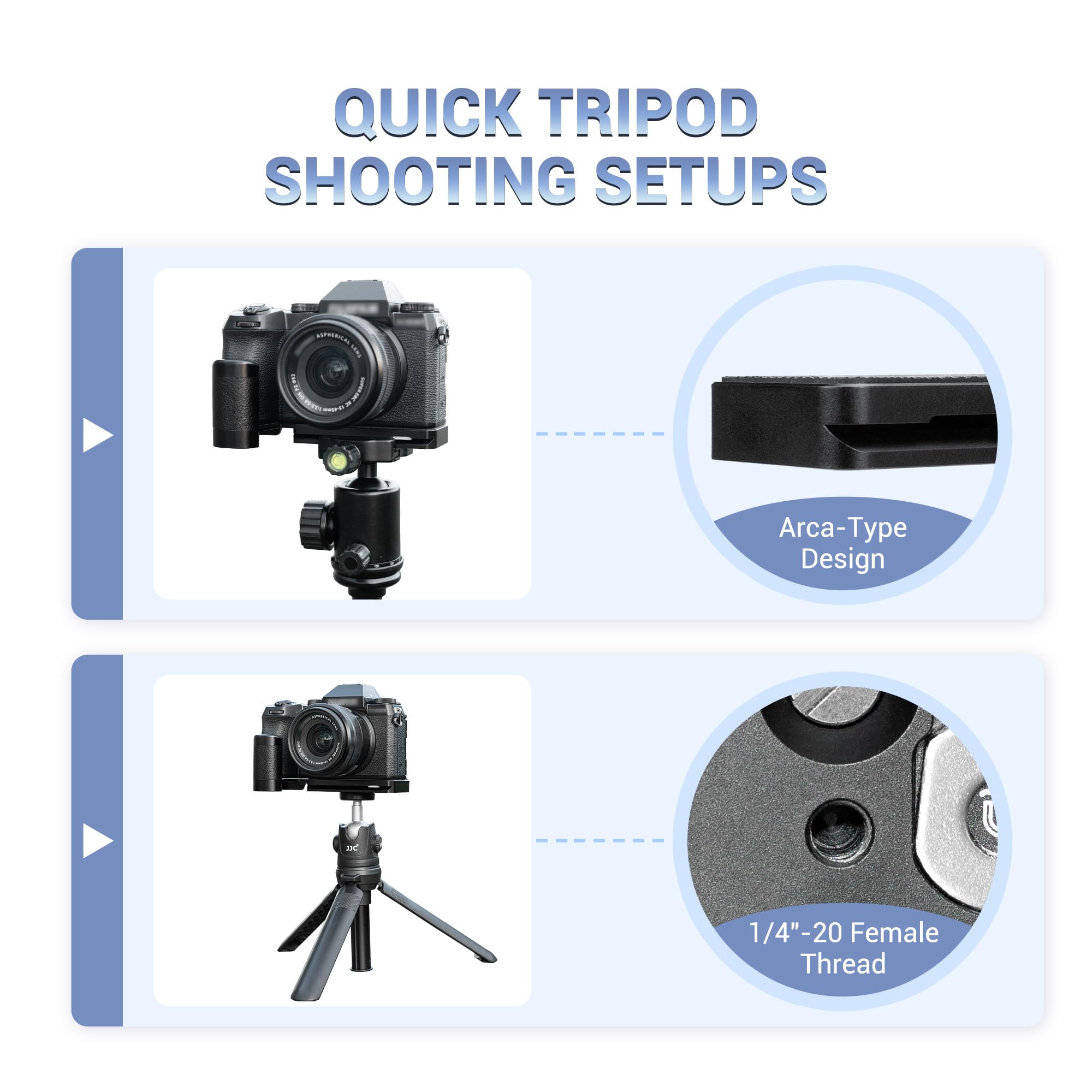 【Arca-Type Design】The hand grip adopts the Arca-Type quick release plate design, and you can slide this grip with the camera onto an Arca-Type ball head directly. It has a 1/4"-20 tripod socket at the bottom, enabling users to mount the camera on a stand or tripod for stabilized shooting.