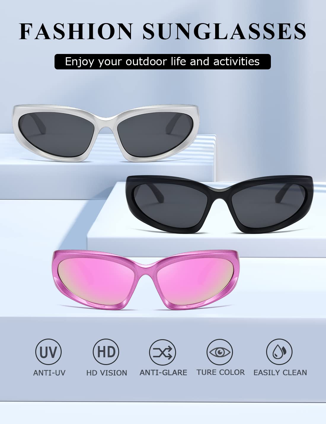 EXCLUSIVE DESIGN-We are dedicated to the development of trendy and unique sunglasses for people who pursue fashion and express their individualities,With retro wraparound eye shape,fit for all kinds of faces.