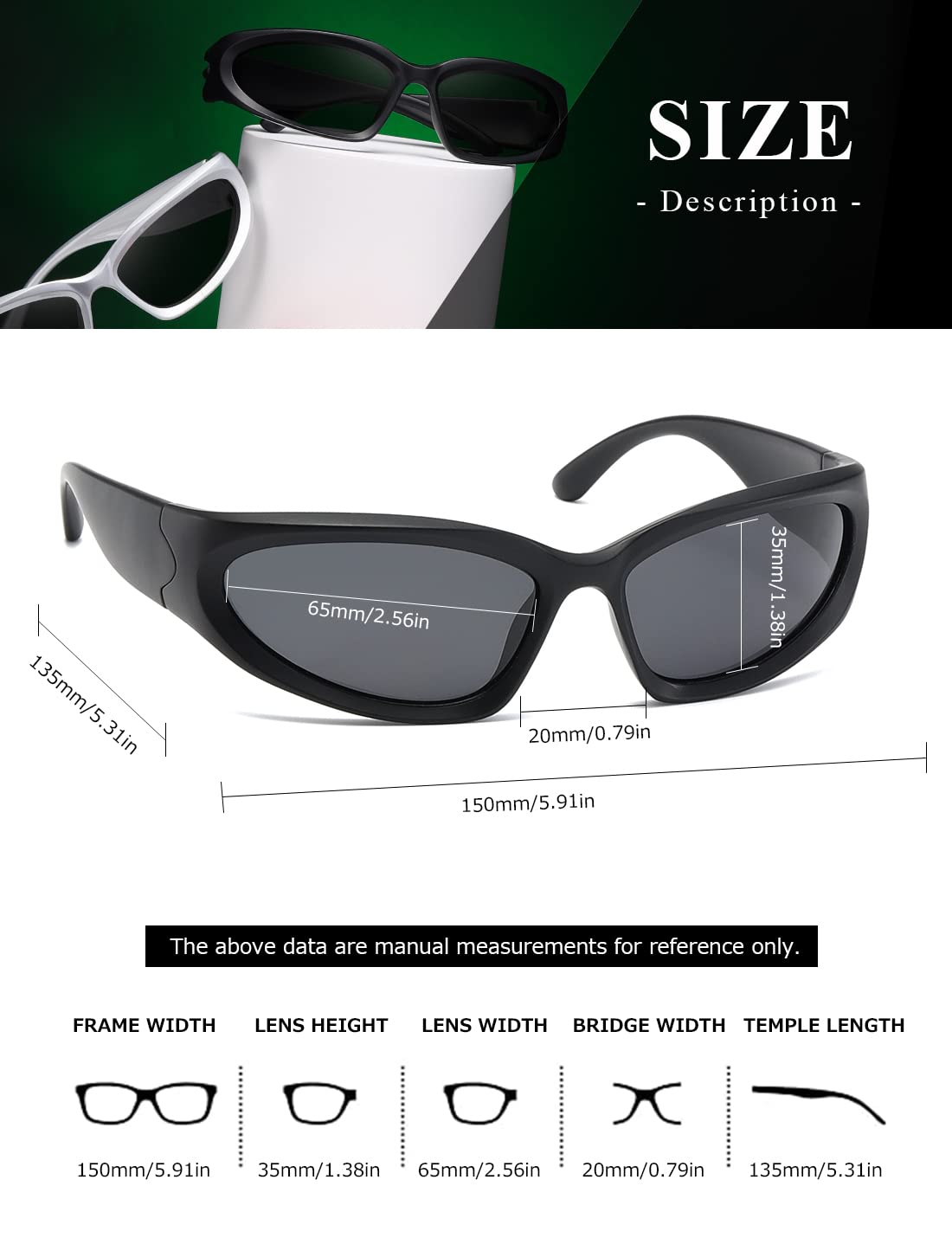 PRODUCT DIMENSION&PACKAGE – Lens Width: 65mm(2.56 inches) | Lens Height: 35mm(1.38inches) | Temple Length: 135mm(5.31 inches) | Nose Bridge: 20mm(0.79inches).PACKAGE –Sunglasses*3, microfiber pouch*3, glasses box*1.