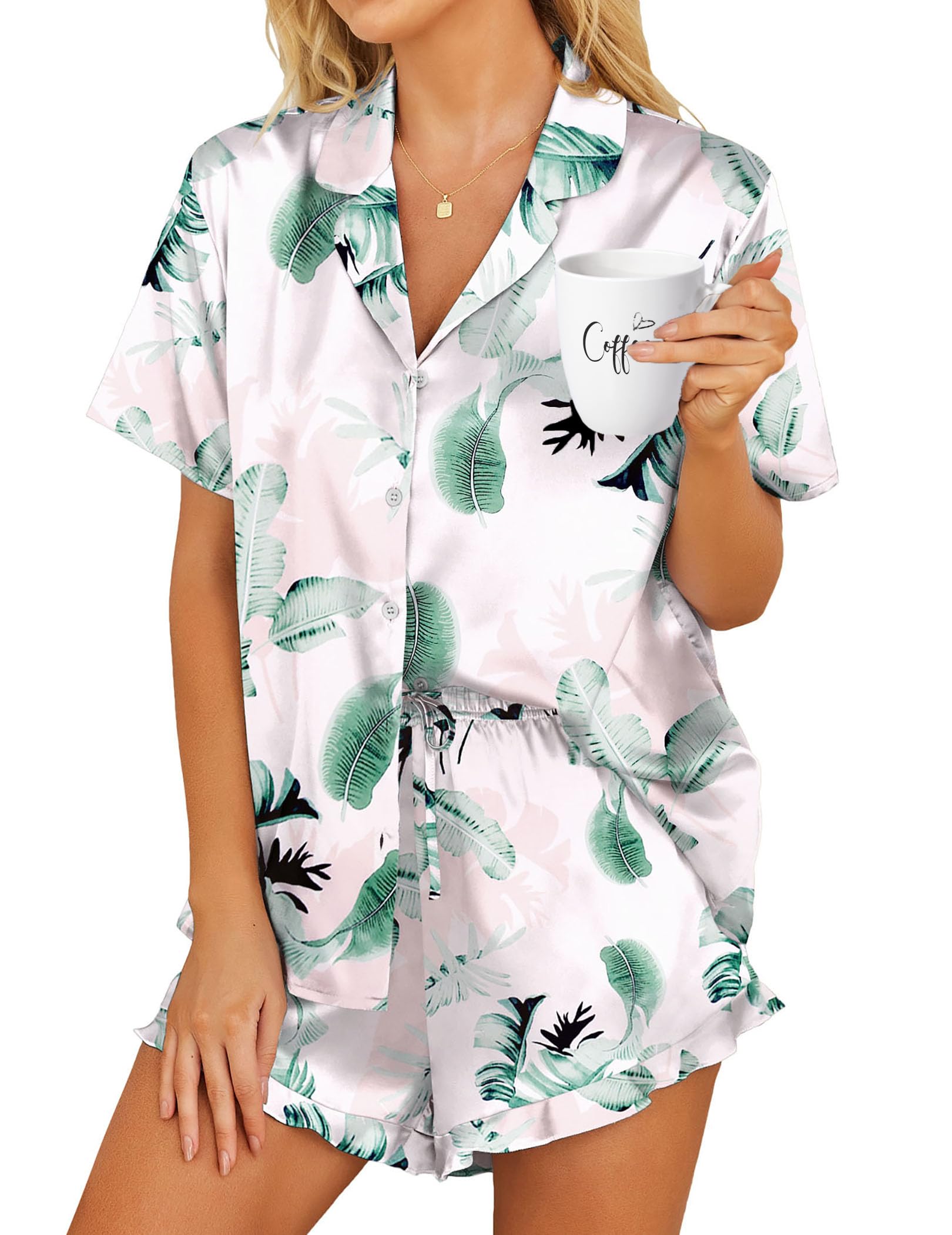 【Unique Fashion Designed】: 2 Piece Satin Pajama Set Featuring Relaxed Style, Short Sleeve, Classic Notch Collar, Full Button Design is easy to put on and take off. Cute Print Pj Set With Elastic Waist Contrast Trim Pajama Shorts will give you more comfortable and freendom feeling when you wear it.