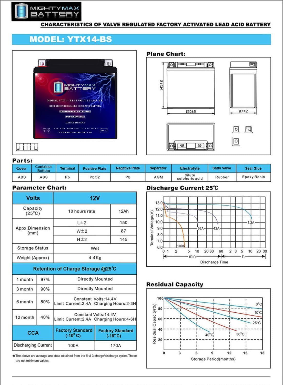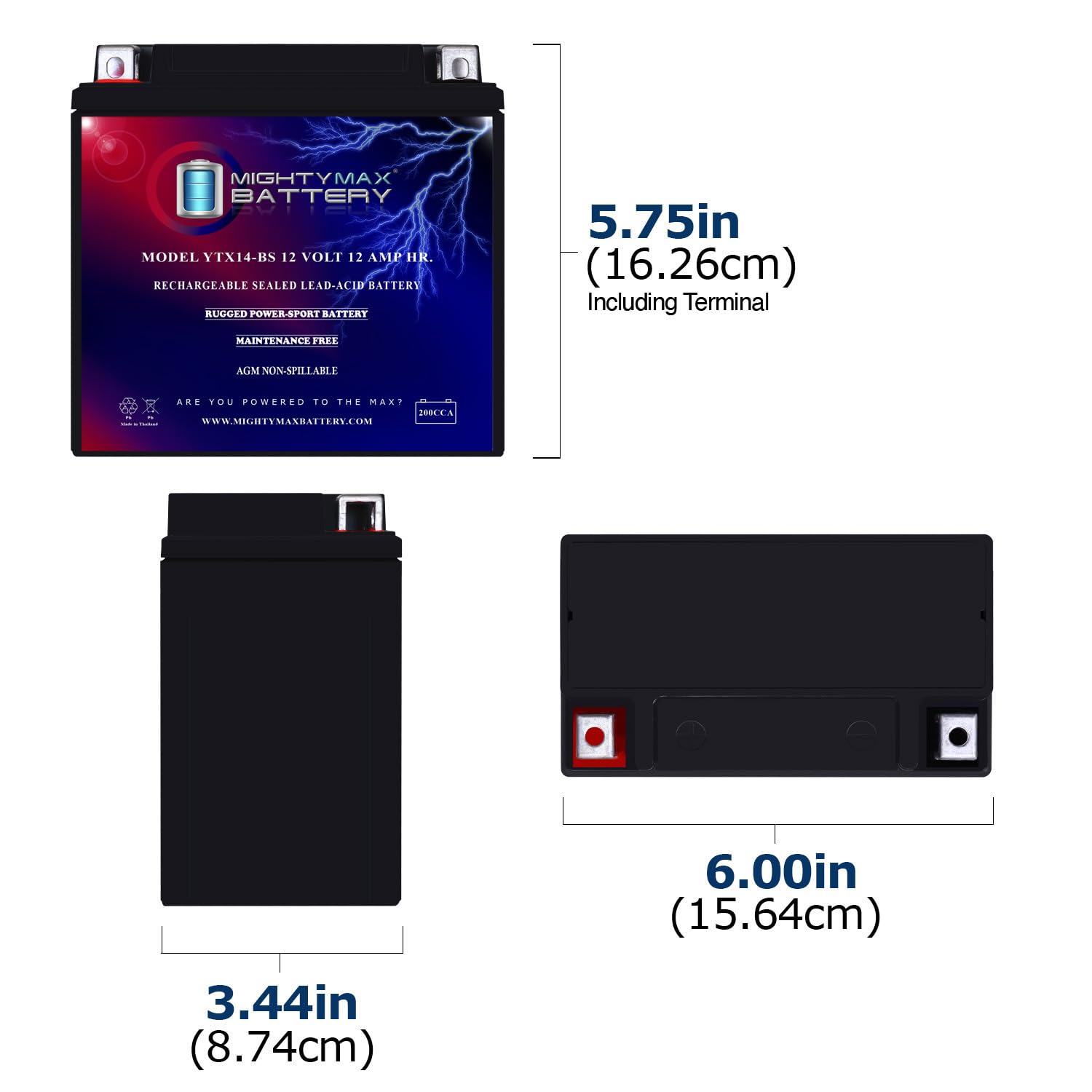 YTX14-BS is a 12V 12AH 200 Cold Cranking Amps (CCA) Sealed Lead Acid (SLA) Battery