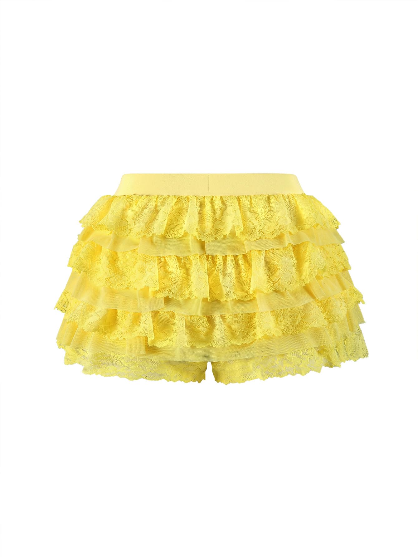 Features: This lace panty is decorated with layered ruffles of lace, a small bow at the front, an elasticated waistband, a rise, and a solid color design. This panty has a cute, sweet, and trendy feminine style, and it looks a lot like a mini skirt when