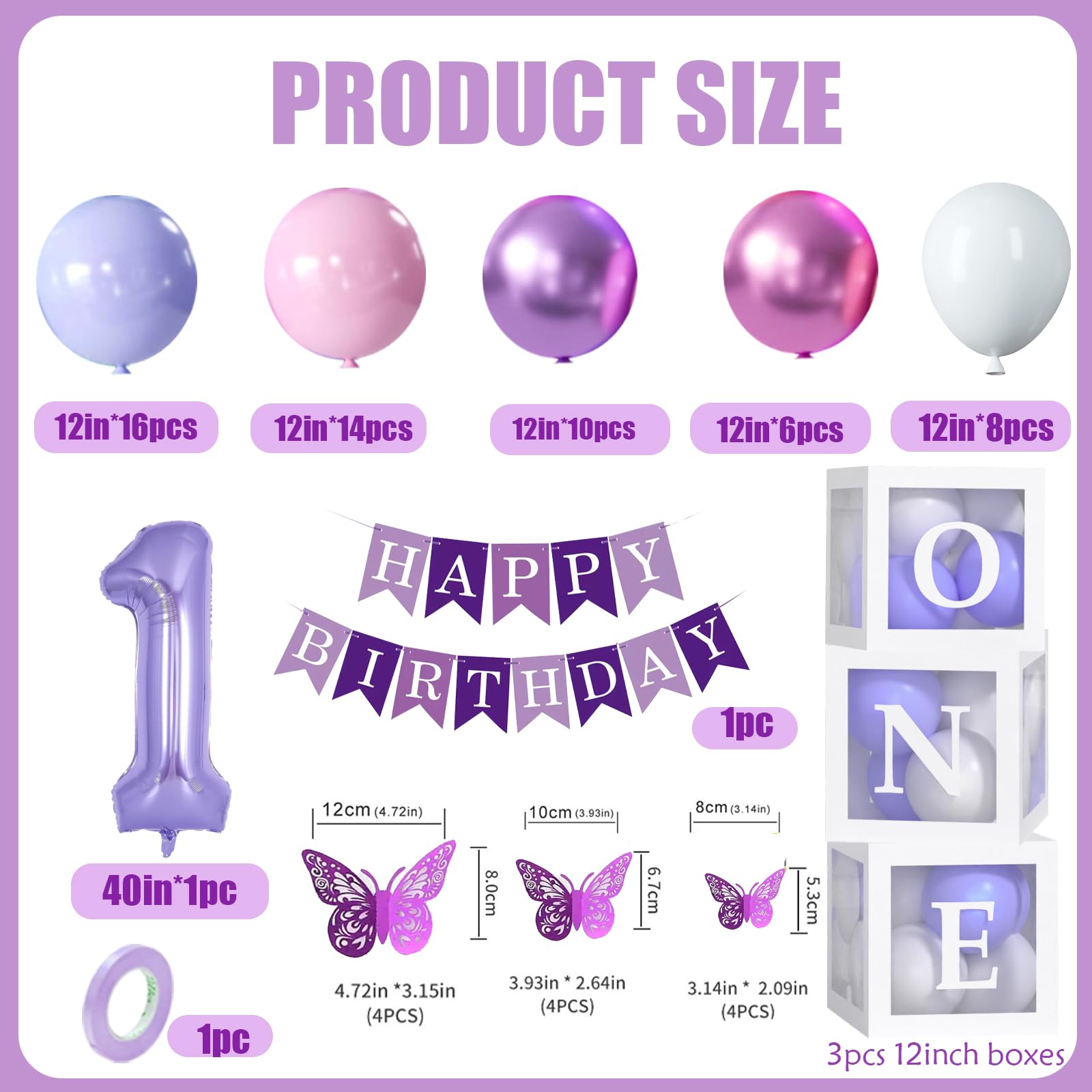 【VALUABLE PACK】60pcs 1st birthday decorations girl include: 40inch purple 1 balloon, purple HAPPY BIRTHDAY banner, 16pcs 12inch pastel purple balloons, 14pcs 12inch pastel pink balloons, 10pcs 12inch purple balloons, 6pcs 12inch metallic pink balloons,8pcs 12inch pastel white balloons, 12pcs 3D purple butterflies stickers,3pcs clear balloon box with "one" stickers and 1 roll ribbon.