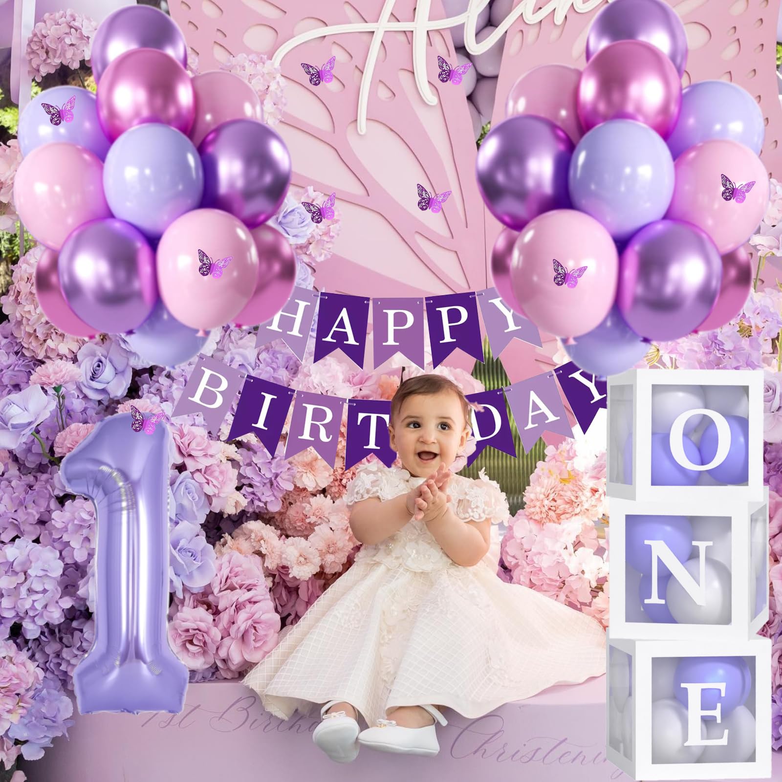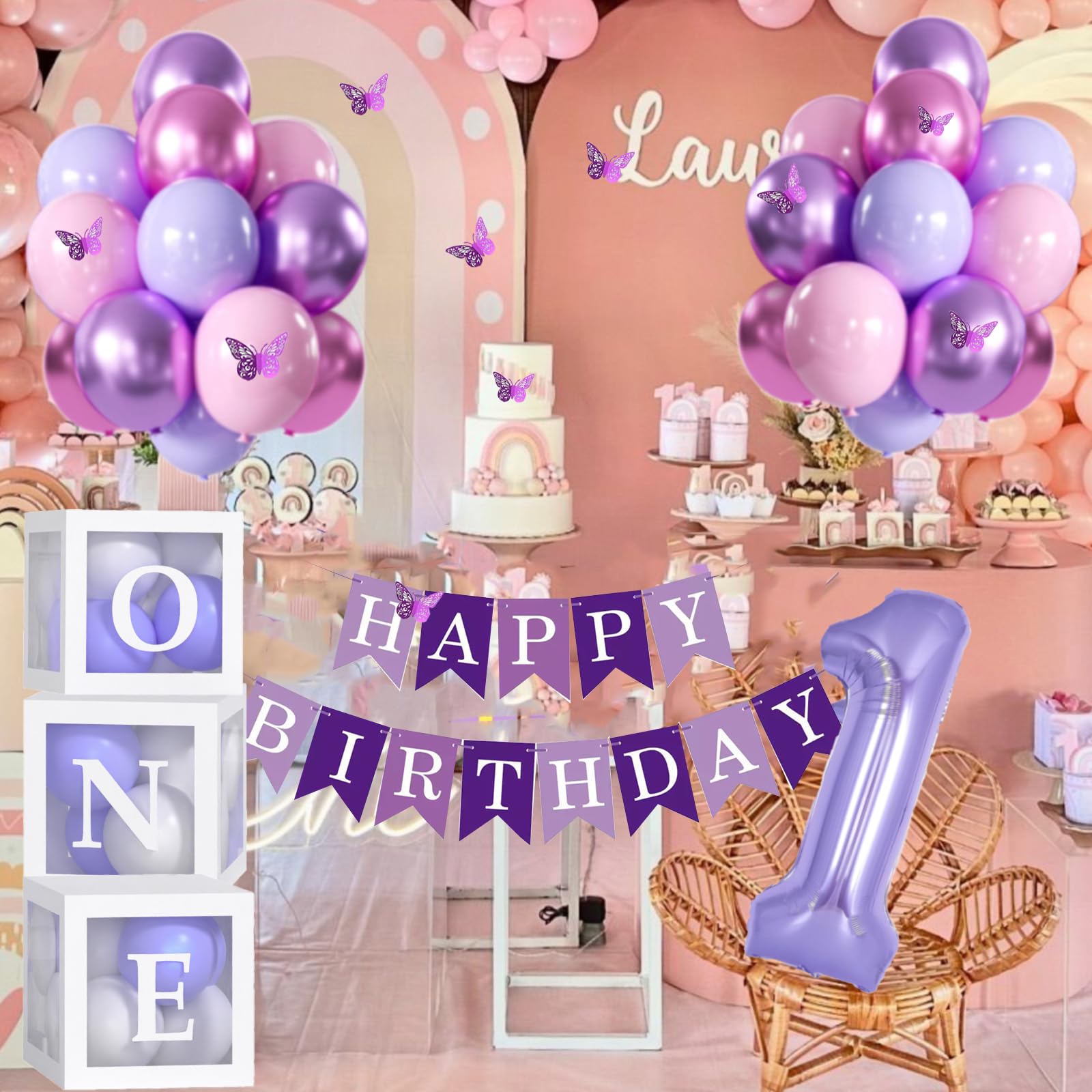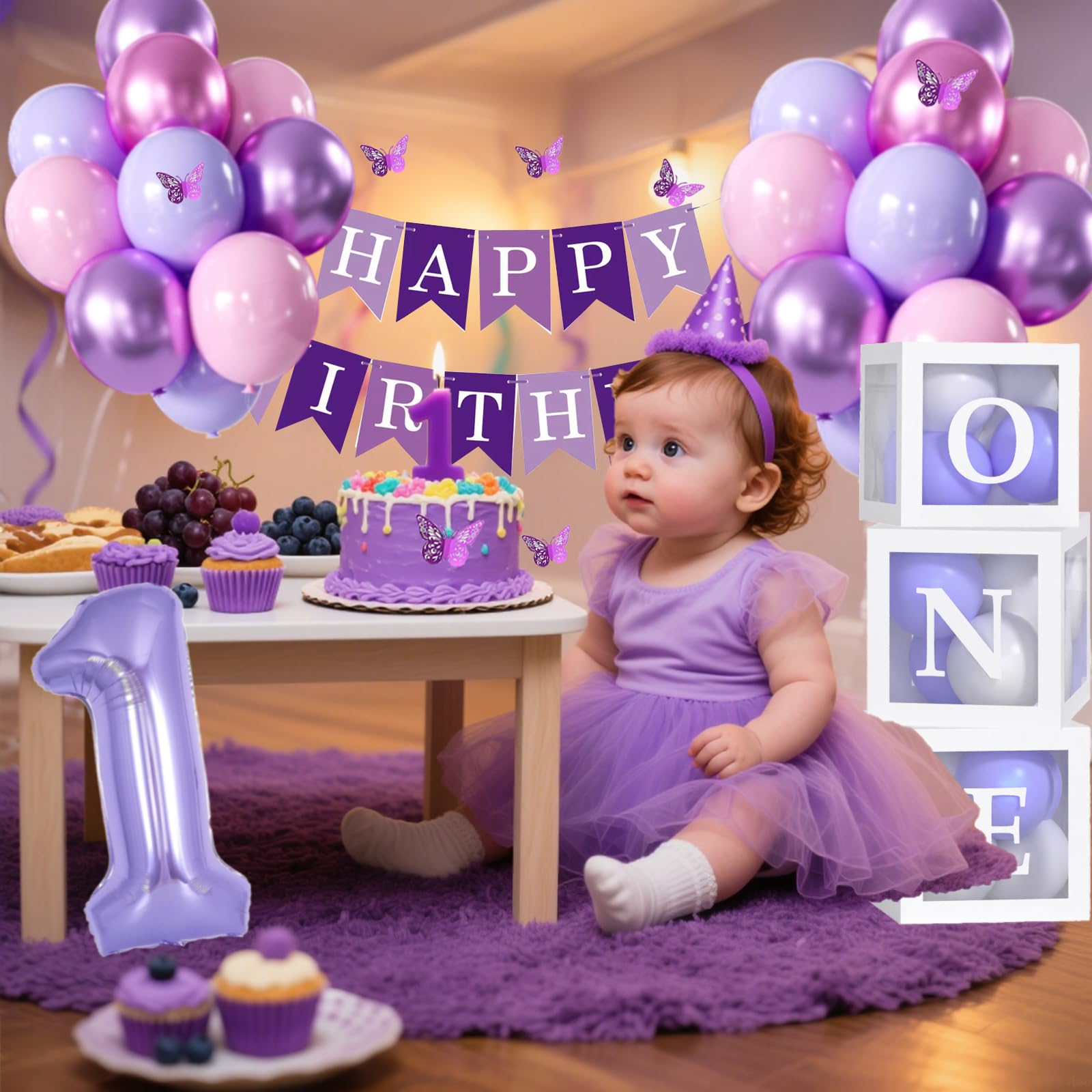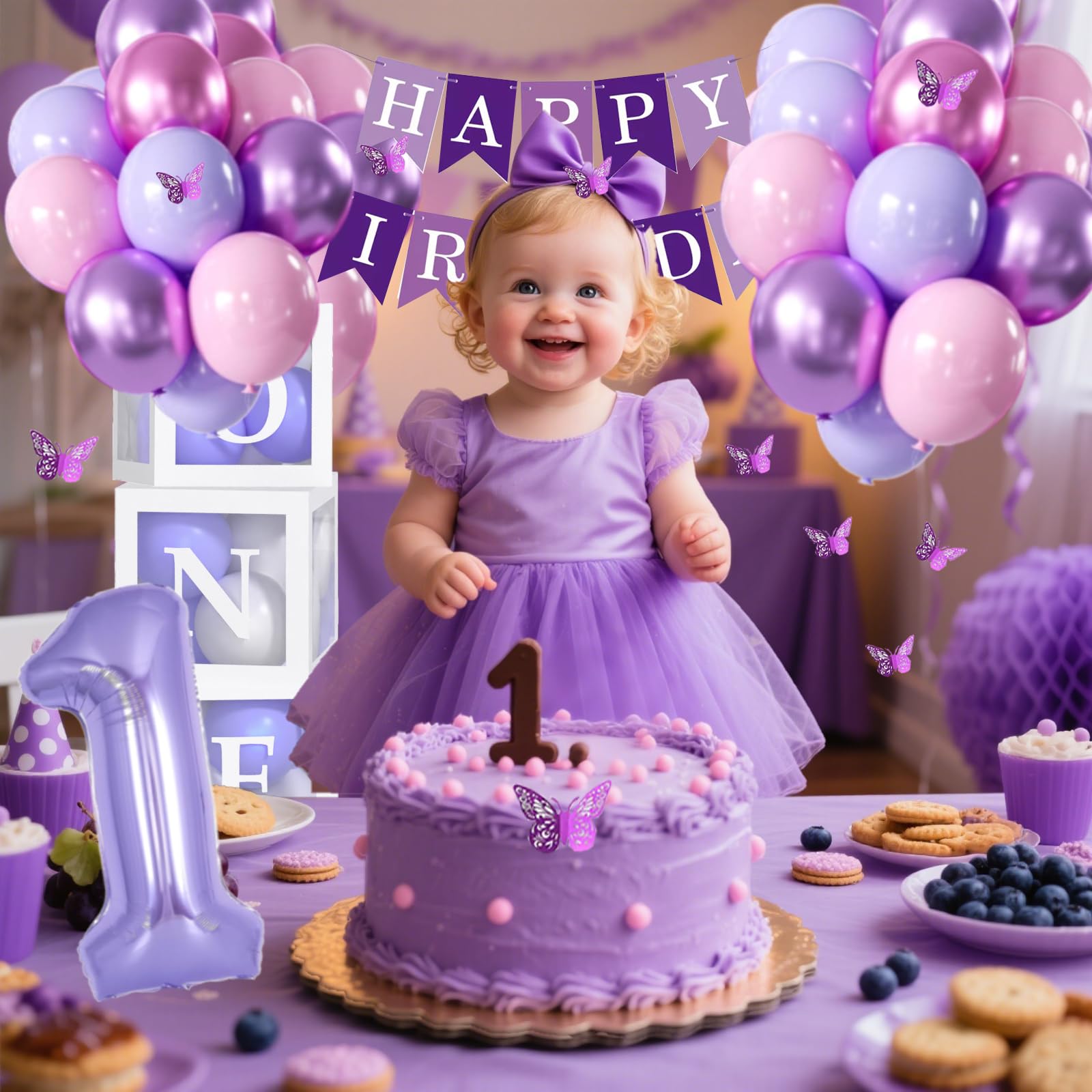 Baby Girl Purple First Birthday Decorations-Pastel Purple Balloons, 40 Inch Purple 1 Balloons, 3D Butterflies Stickers,Happy Birthday Banner One Balloon Boxes For 1 Year Old Girl BD Decorations