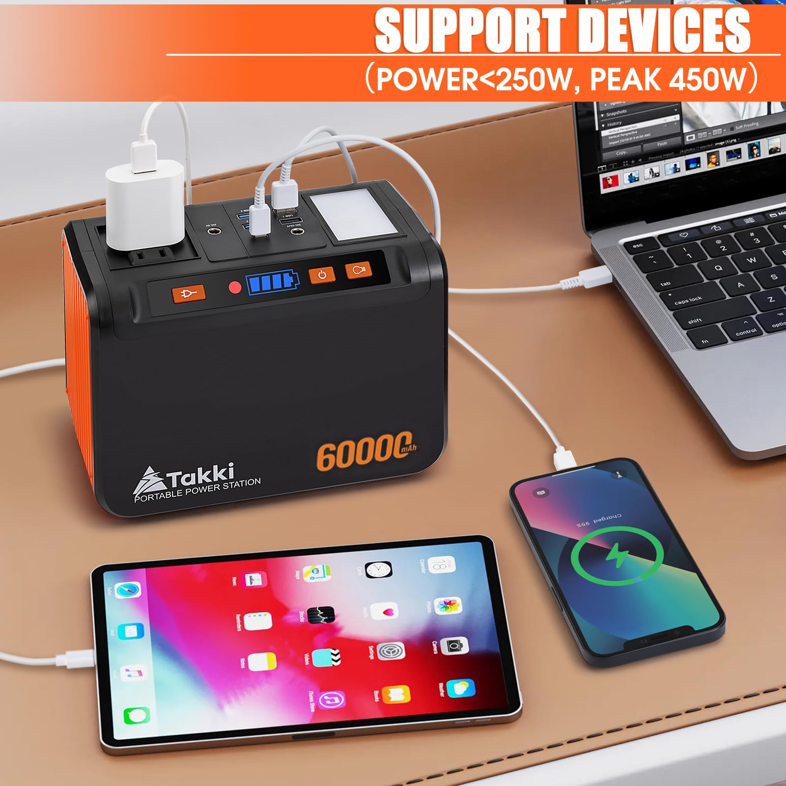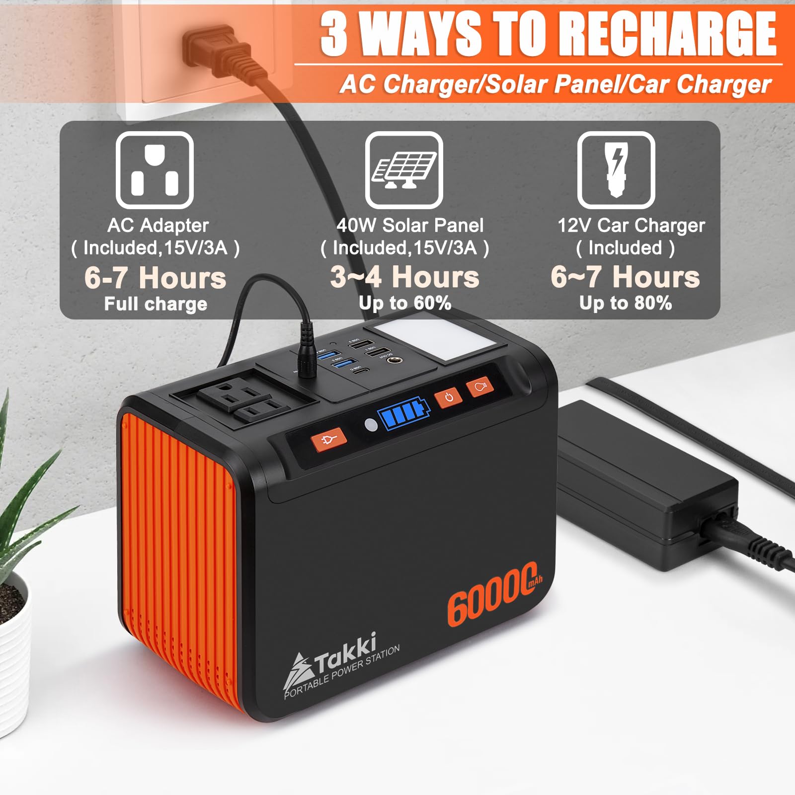 Solar Powered Generator: Built-in 222Wh(60000mAh, 3.7V) solar generator capacity with 40W panel set included, powering many small appliances within 250W. The power station charges laptops 3.5 times, smartphones 17+ times, runs mini car fridge for 3+ hours, or runs CPAP for 3+ hours, ideal for extended camping trips, outdoor activities and home emergency. This solar power bank can charge from 0% to 80% in 4 hours with the included AC charger.