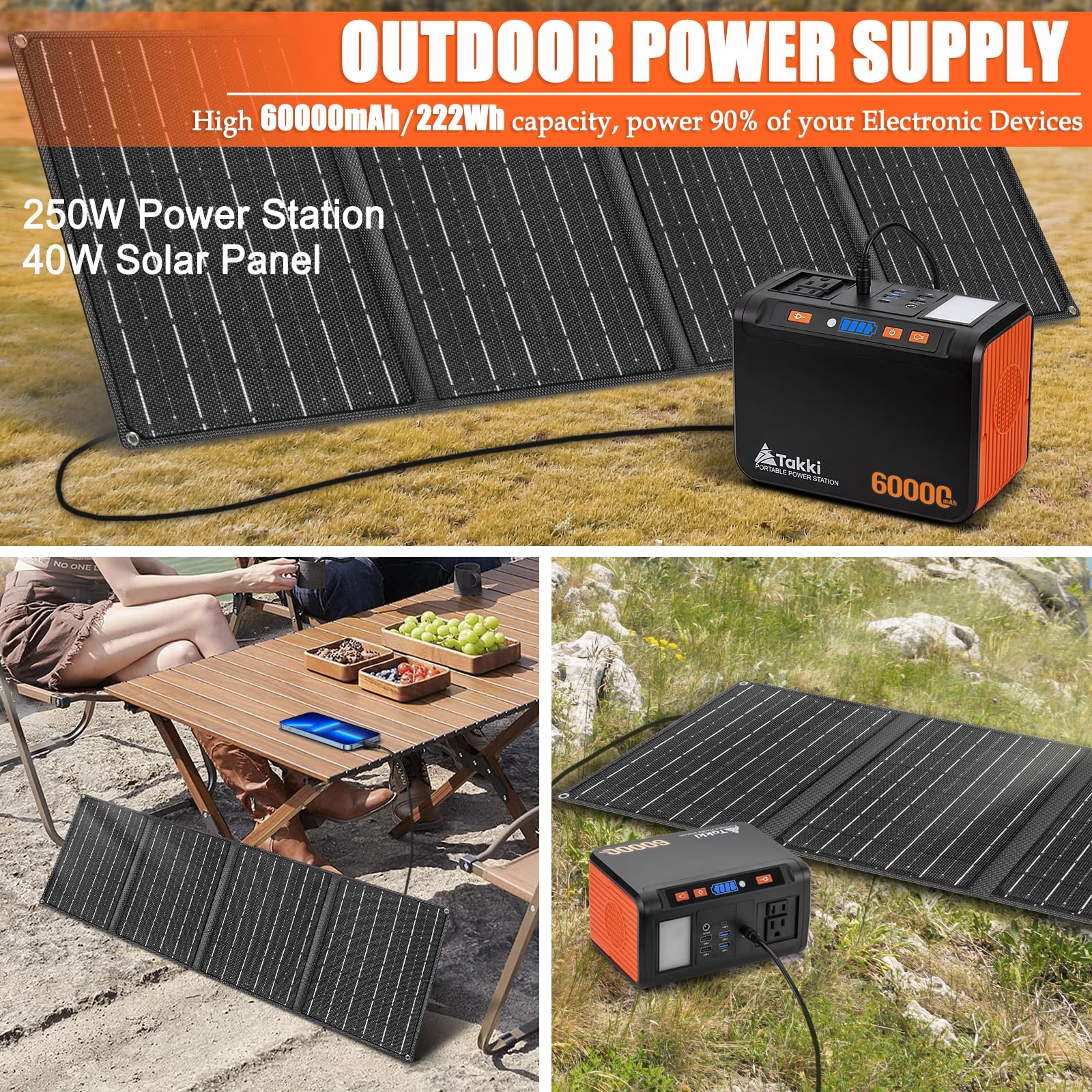 Emergency Power Supply: The combination of Takki solar panel 40W and Takki 250W camping solar generator with compact handle design and silent operation with cooling vents is ideal portable power kits for tent camping gear, road trip, school projects and many other outdoor activities which needs electric power. The Battery Management System (BMS) allows for voltage control, temperature control and more advanced safety operations.