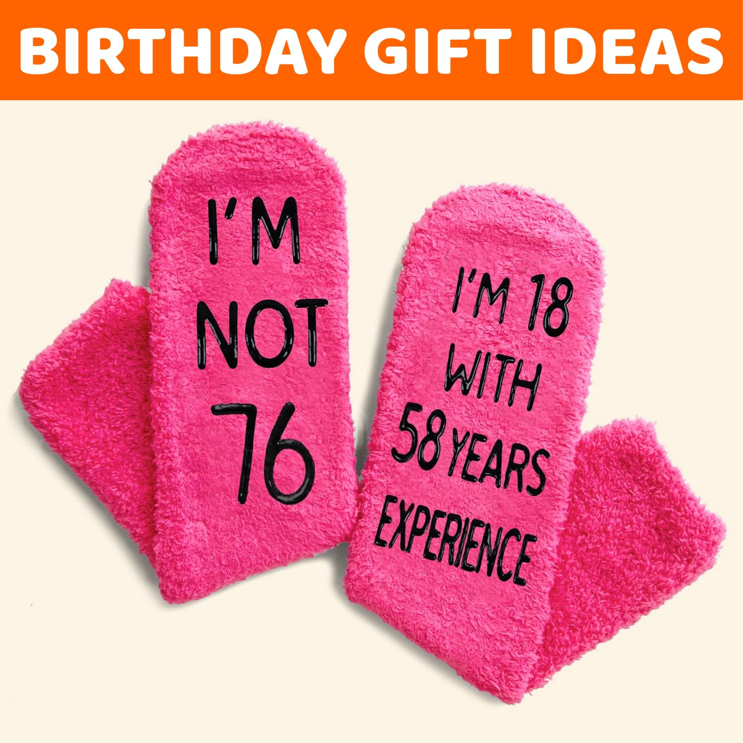 GIFTS FOR WOMEN IN THEIR 76S: Say it with socks - "I'M NOT 76, I'M 18 WITH 58 YEARS EXPERIENCE." These are suitable for any holiday gifts, such as Birthday gifts, White Elephant gifts, Christmas gifts, Mothers Day gifts.