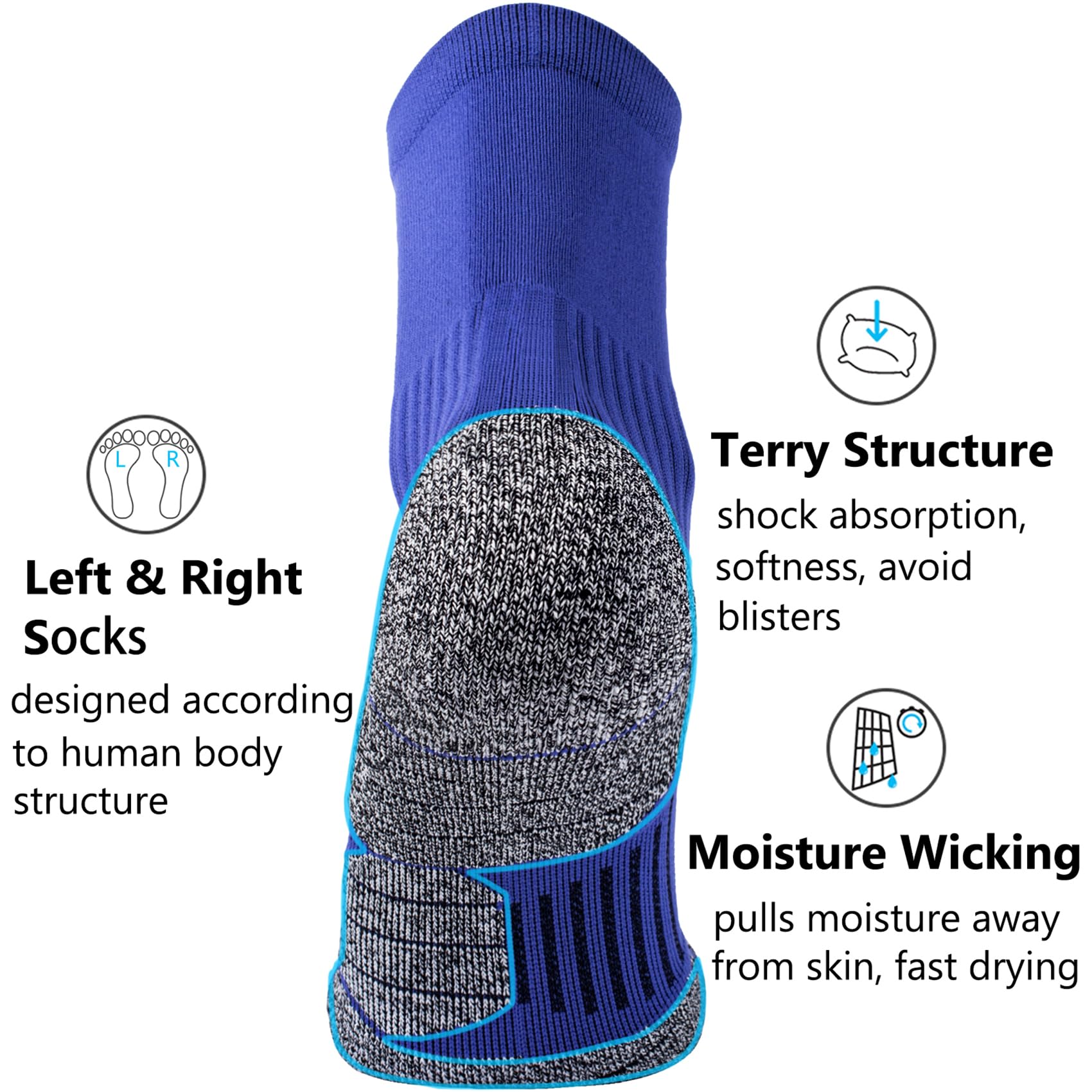 UNIQUE SOLE: Moisture wicking fibers pull moisture away from skin; Cushioned, more soft and comfy, shock absorption; Design LEFT AND RIGHT SOCKS according to the plantar structure