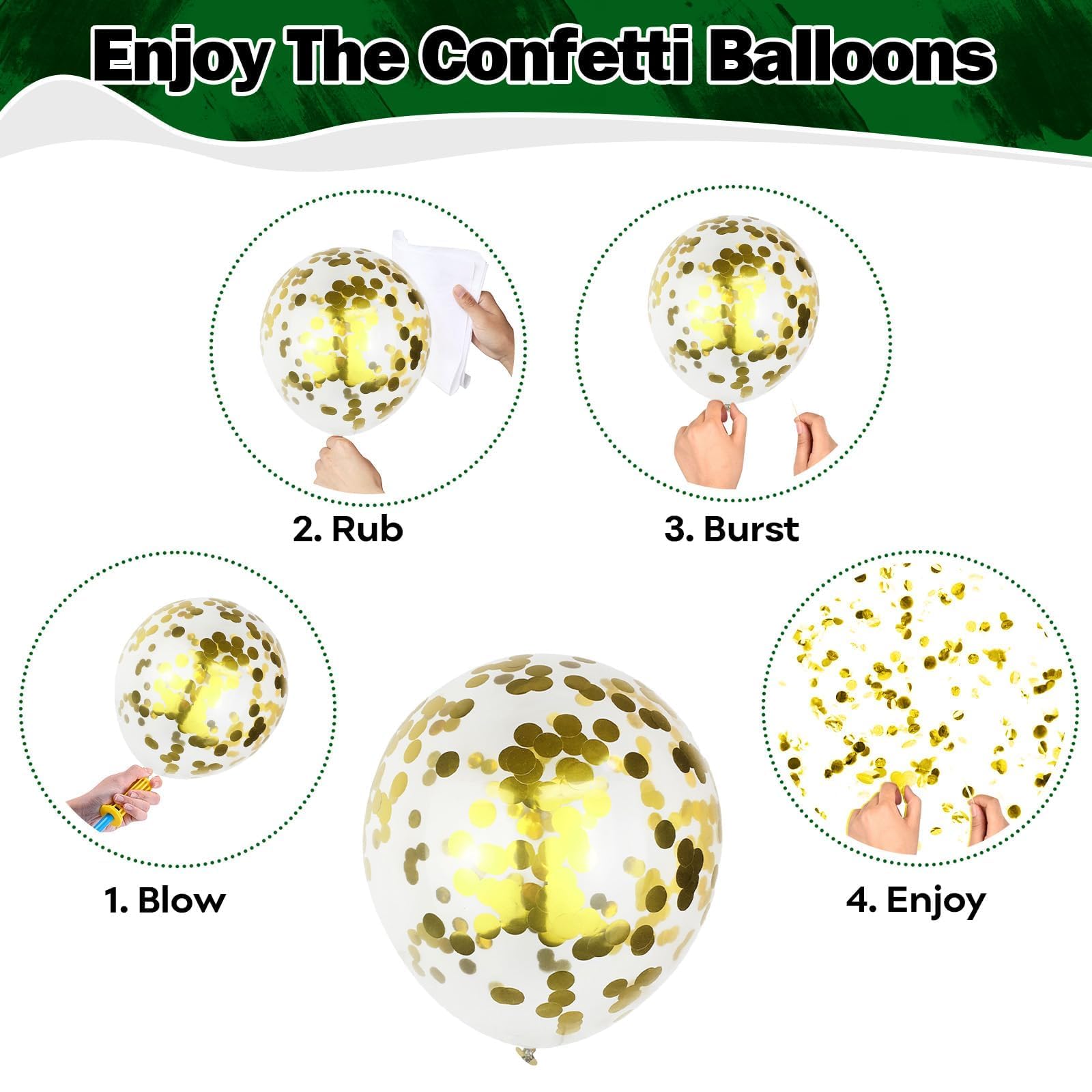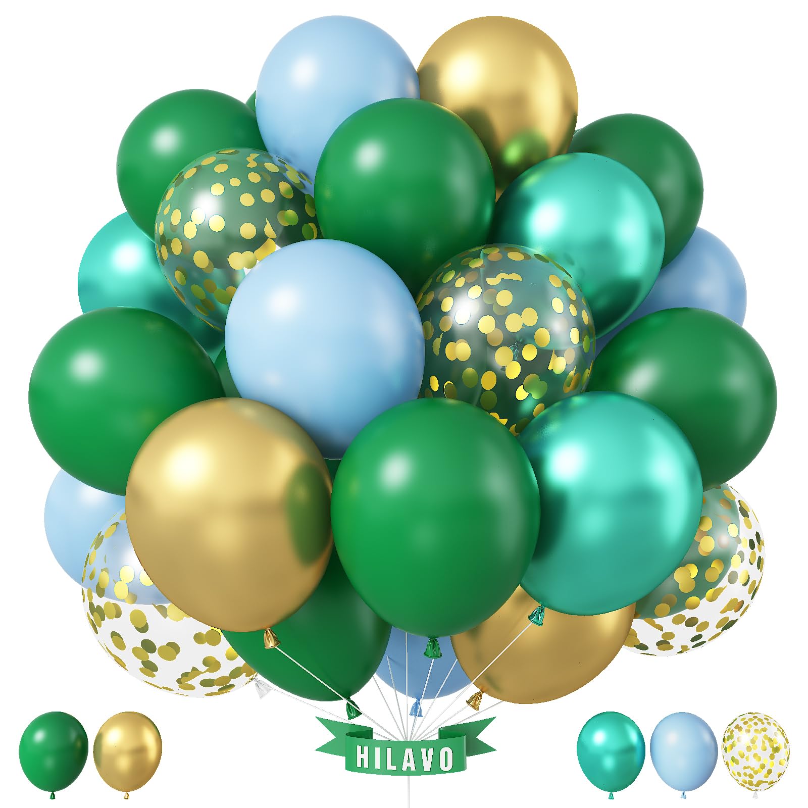 🎈Package Includes - You'll get 35 pieces 12 inch party balloons (15pcs dark green balloons, 5pcs metallic green balloons, 5pcs pastel blue balloons, 5pcs metallic gold balloons, 5pcs gold confetti balloons) and 1 roll of 10m ribbon, which are enough to decorate your party, these dazzling colors will make your party very attractive, a great way to decorate any theme party. You can make your balloon backdrop, balloon arch garland, balloon bouquet, home or table decorations and more.