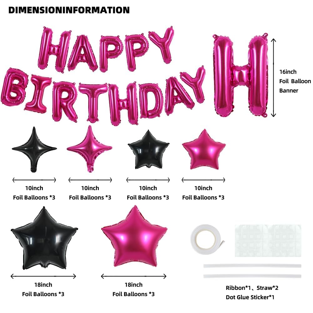PACKACKAGE INCLUDES-- 13 Pcs "Happy Birthday" letter balloons, each letter balloon measurement about 16 Inch. And 18pcs star balloons with 2pcs straw ,1pcs ribbon and 1 sheet of double-sided glue point dot.