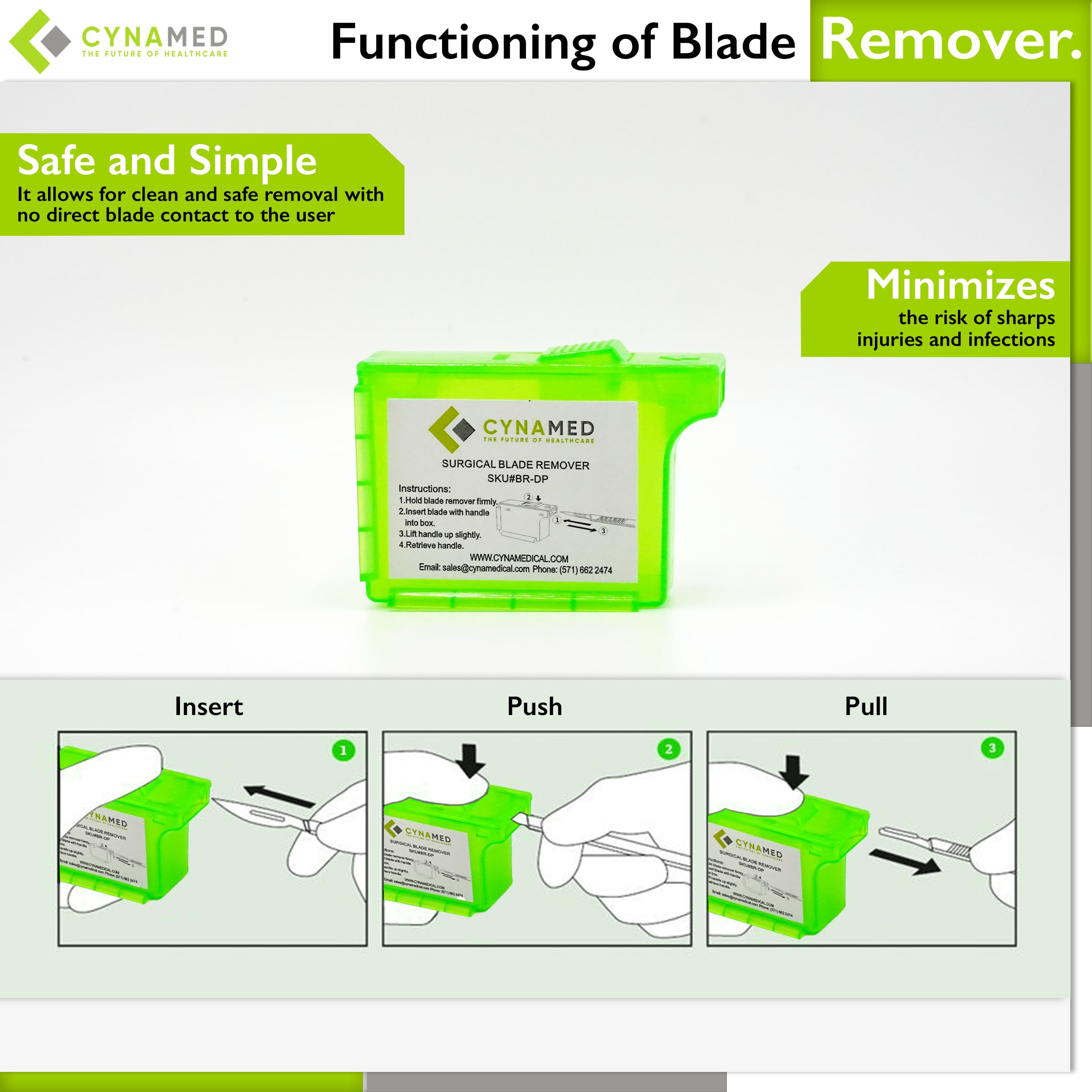 Are you worried about the proper disposal of used blades in your lock-on scalpel handles? Effortlessly Extract Blades from Lock-on Handles Safe Storage of Used Blades in the Box Disposable Solution Palm-sized: holds up to 300 blades Durable polypropylene: rigid plastic protects user from sharp blades inside Just insert the scalpel into the remover, press a button, and extract the handle smoothly. The disposable unit ensures the secure and safe retention of sharp blades.