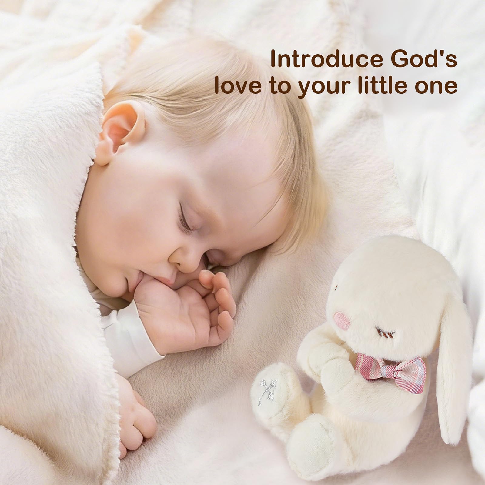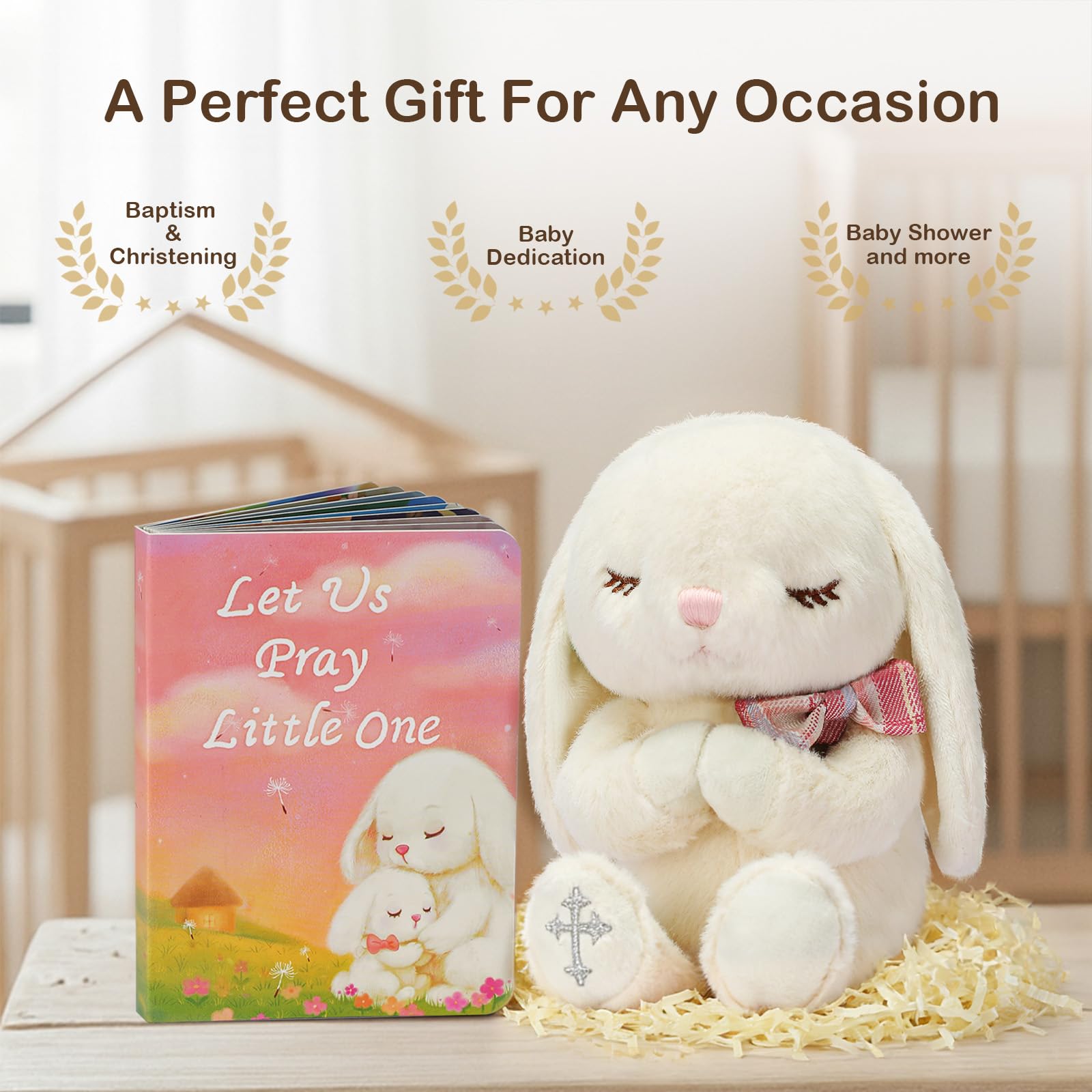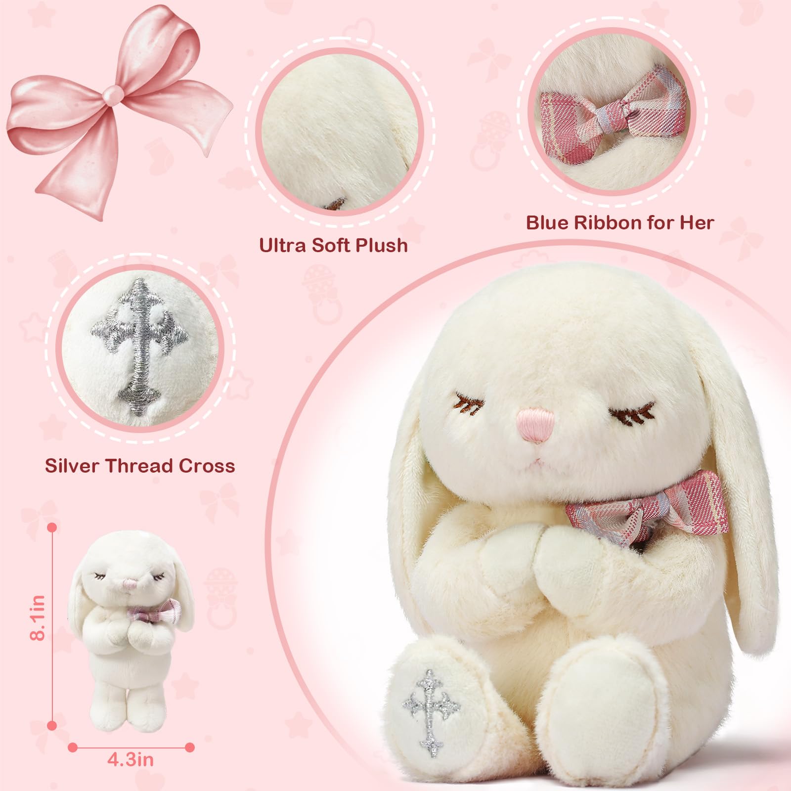A Thoughtful Christening and Baptism Gifts For Girl - Adorable 7" praying stuffed animal bunny combined with baby prayer book makes a great bedtime set. And this lovely designed plush toy bunny will be baby's favorite bedtime buddy for years!