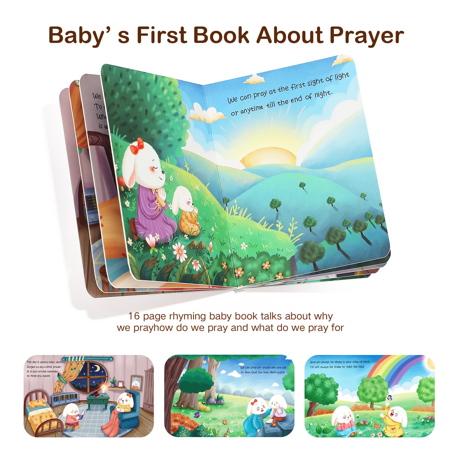 Introduce God's Love to The Little One - Beautifully illustrated 16 page Let Us Pray baby book talks about why we pray, how do we pray and what do we pray for. This book is perfect for small hands and has a rounded corner design for baby's safety.