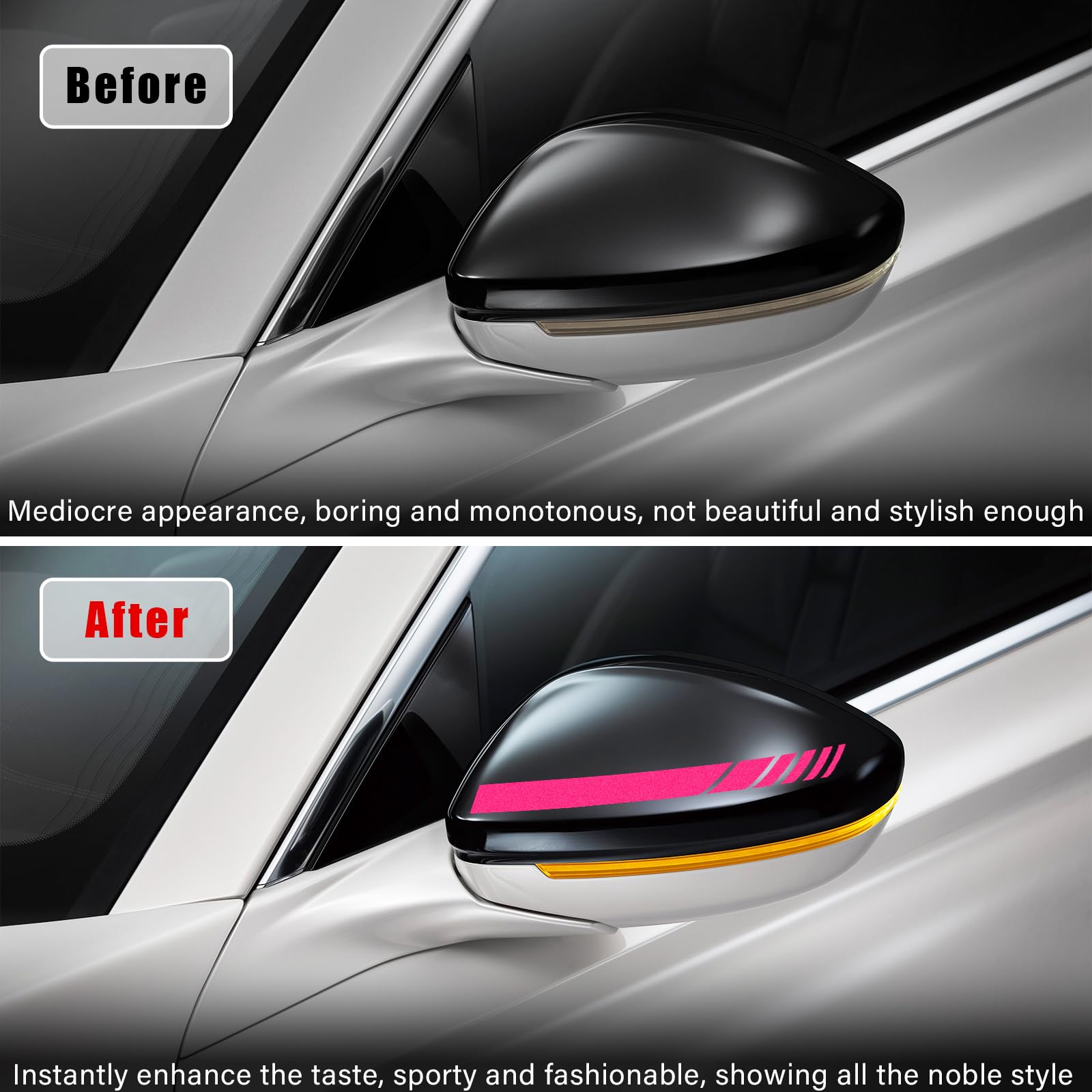 【Beautiful & Practical】: The striped shape of the rearview mirror decal design is fashionable and eye-catching, which greatly enhances the grade of your car. And the decals can cover previous scratches, giving your car a new look and preventing new scratches from occuring.