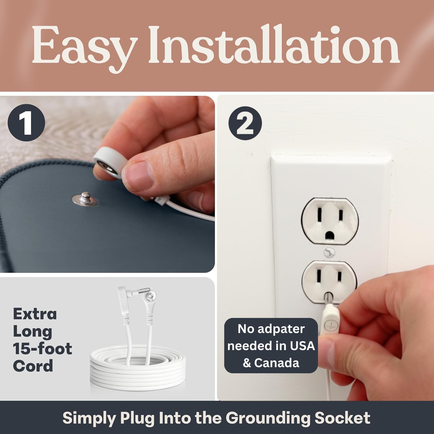 EASY 2-STEP SETUP - Snap cord into mat corner, plug into grounded outlet (no adapters needed for US/Canada). 15-foot cord reaches desk, bed, or couch easily. Don't feel anything? That's normal - grounding works subtly over time, not instantly. Use 30+ minutes daily for best results.