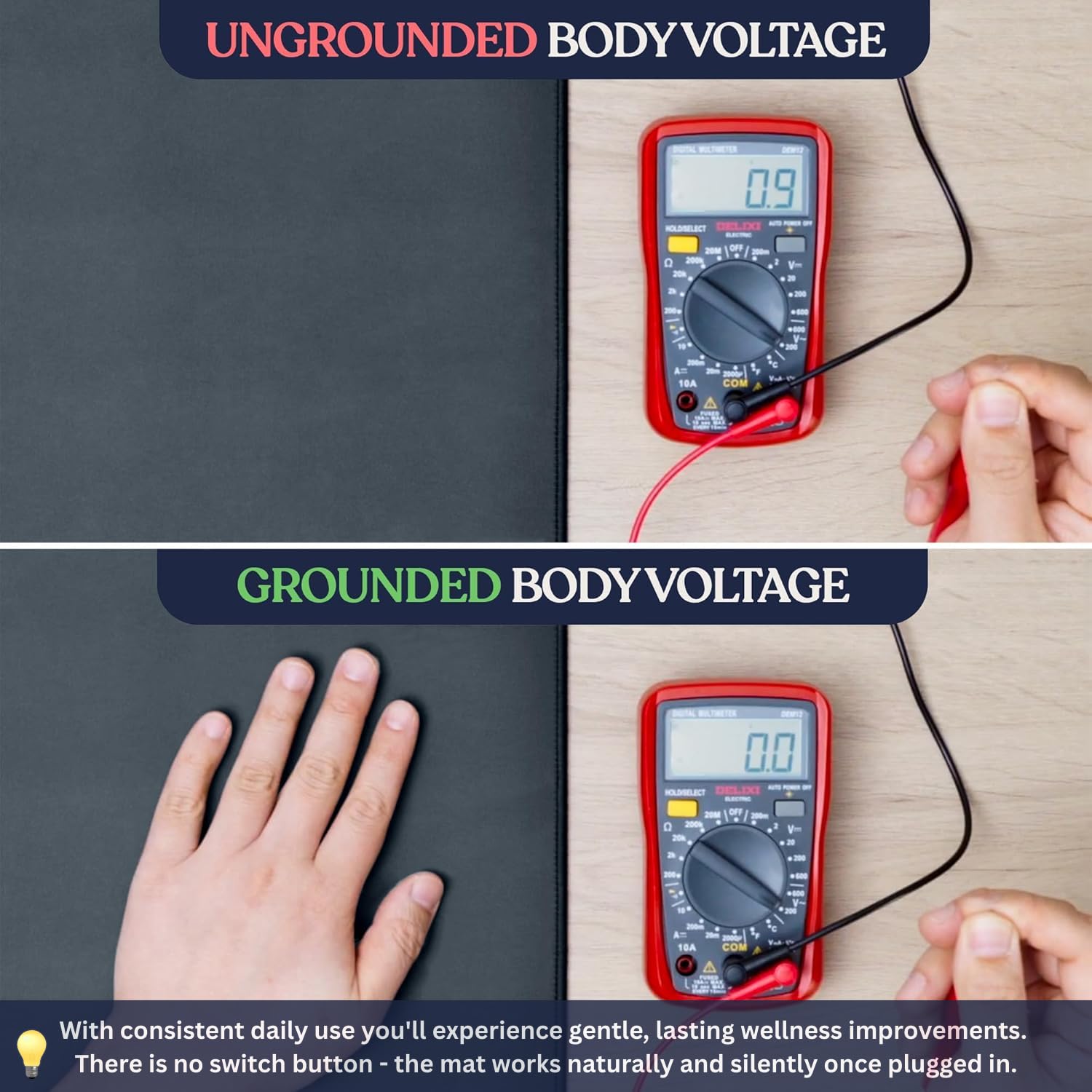 SAFE & TESTED - 100K OHM RESISTOR: Built-in resistor protects against electrical surges for safe daily use. Premium 3-layer construction: skin-friendly PU top, conductive carbon center, non-slip base. Quality-tested for reliable grounding performance. Designed for daily, long-term use
