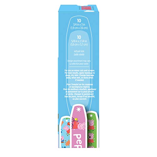 Band-Aid Brand Adhesive Bandages for kids, featuring Peppa Pig designs, cover and protect minor cuts and scrapes with fun graphics from the animated series. These sterile bandages come in assorted sizes with designs that include Peppa Pig and George Pig. Band-Aid Brand Adhesive Bandages stick to the skin, not the wound. This package contains 20 sterile bandages in assorted sizes suitable for small wounds.