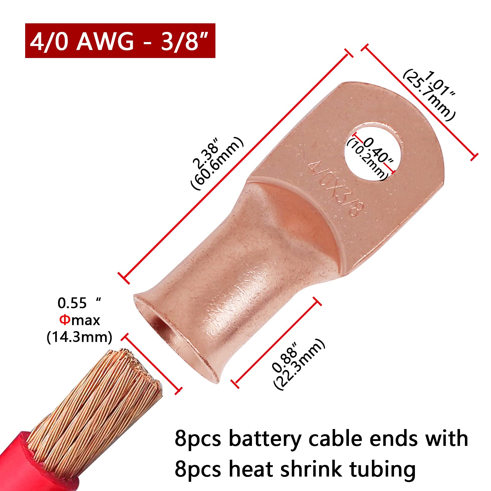 【What You Get:】 8 Pcs per pack of 4/0 Guage (AWG) 3/8" ring terminals, copper lugs closed end termination ring terminals with 8 Pcs 3:1 Dual Wall Adhesive Heat Shrink Tubing Tube for your work(4pcs Black and 4pcs Red).
