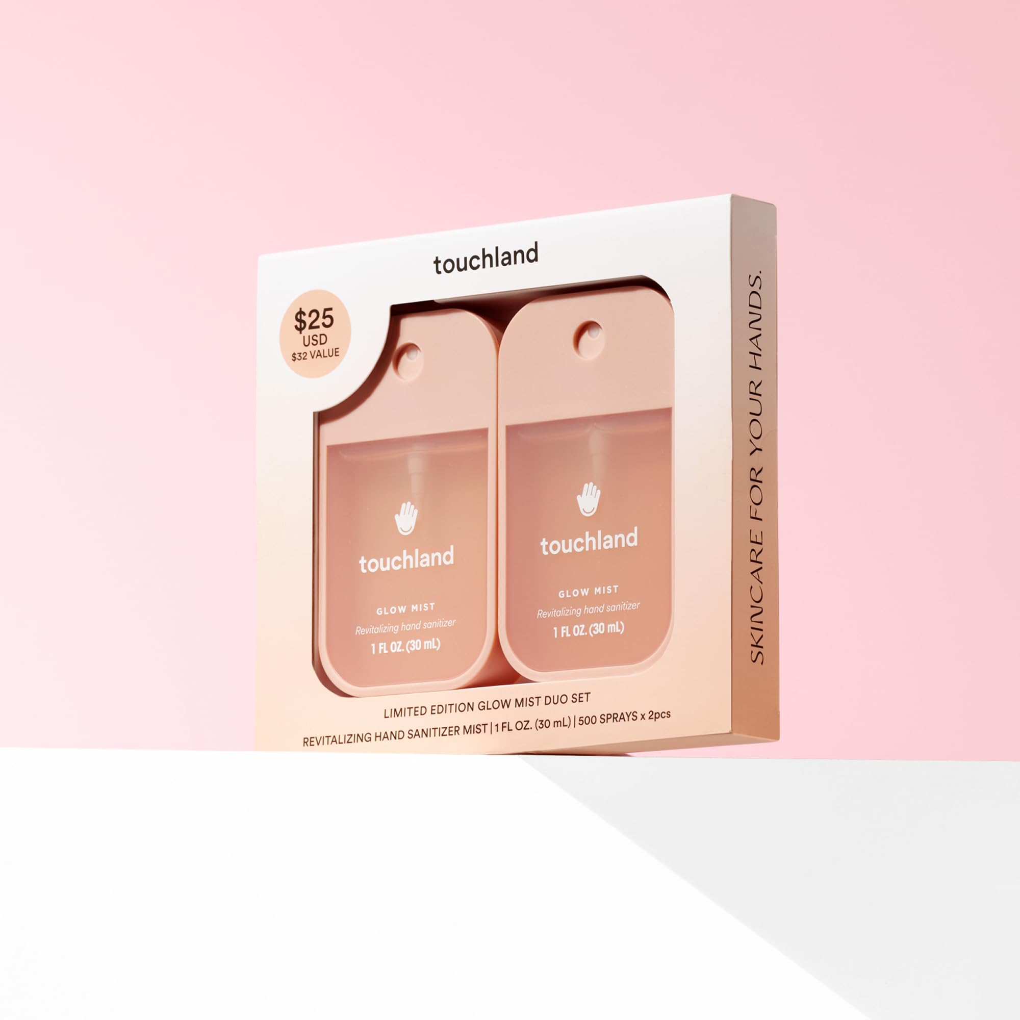 GLOW MIST REVITALIZING HAND SANITIZER: A set of two revitalizing hand sanitizers enriched with DetoskinTM and VitasourceTM, leaving hands sanitized and visibly restoring your skin’s youthful glow.