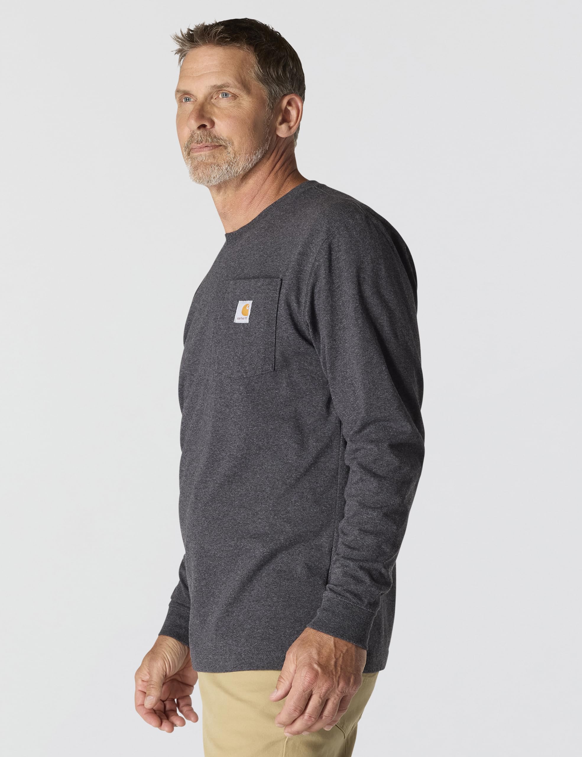 Description Product Description Heavyweight, durable and casual. Holds up when you put it through the ringer day after day. From the Manufacturer Made of 6.75-ounce, 100% cotton jersey our long sleeve pocket t-shirt makes for perfect workwear layered or worn alone. It features a crew neck with a generous left chest pocket and side-seamed construction to minimize twisting. Ash fiber content is 99%/1% polyester. Heather gray fiber content is 90% cotton/10% polyester.