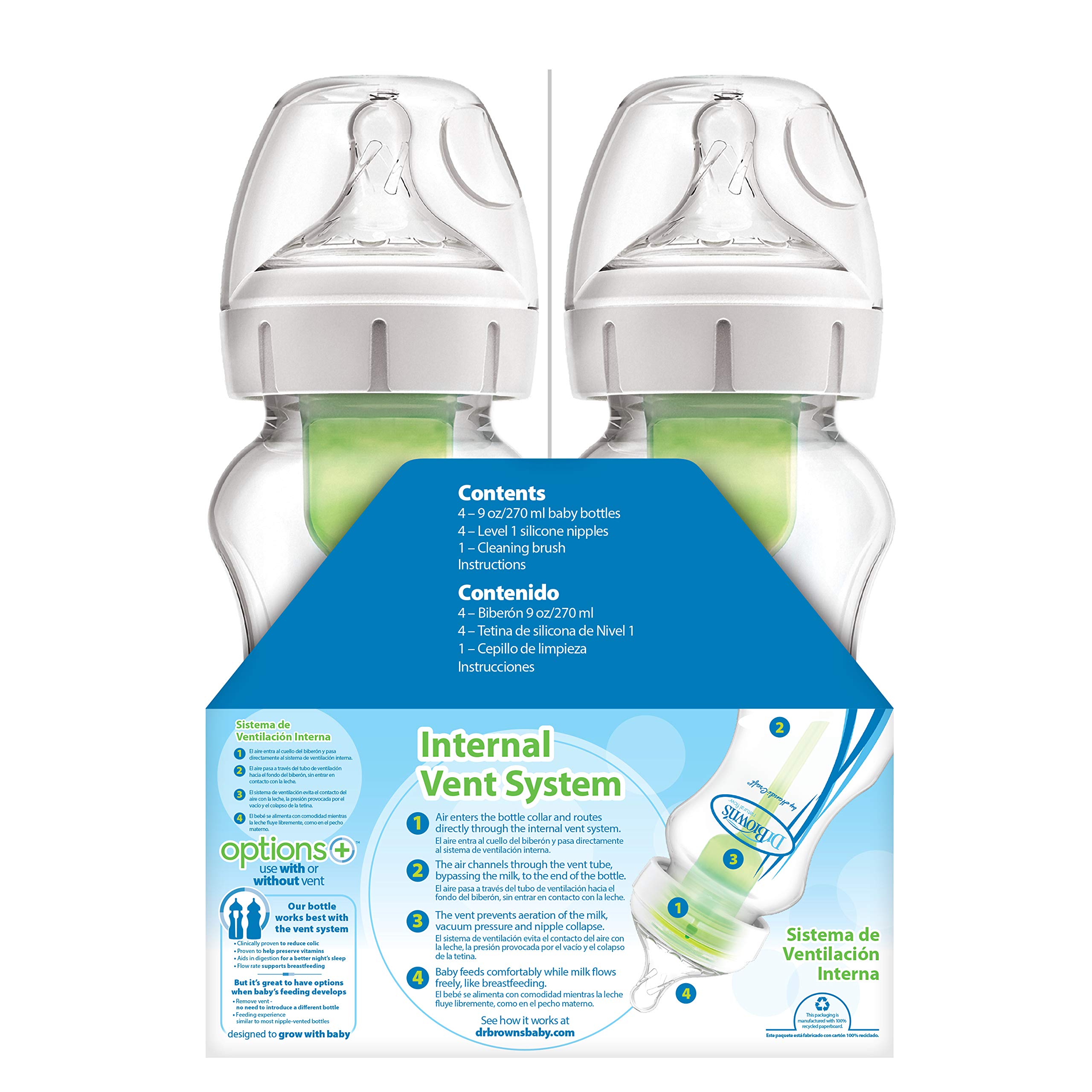 BOTTLE GROWS WITH BABY. Dr. Brown’s Natural Flow Anti-Colic Options+ baby bottle works best with the internal vent system in place but can be removed as baby’s feeding develops – no need to introduce a different bottle.