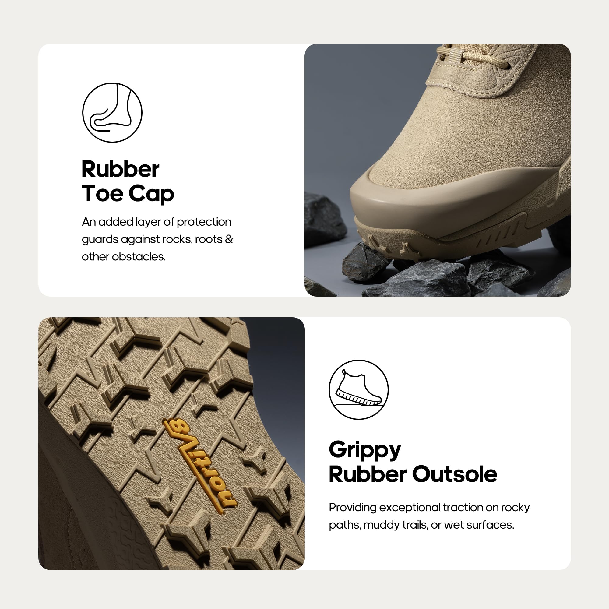 Protective Rubber Toe: The reinforced rubber toe cap ensures protection for your toes, making these boots an ideal choice for various activities.