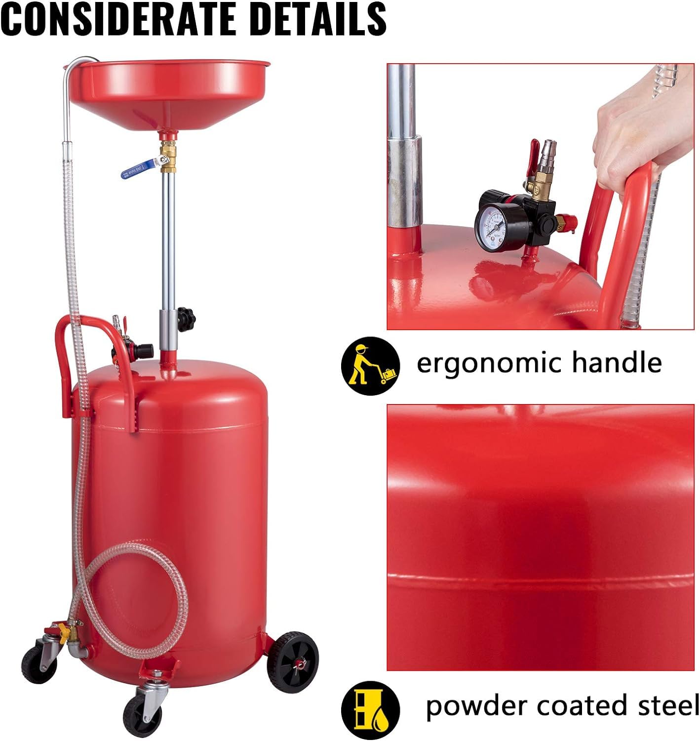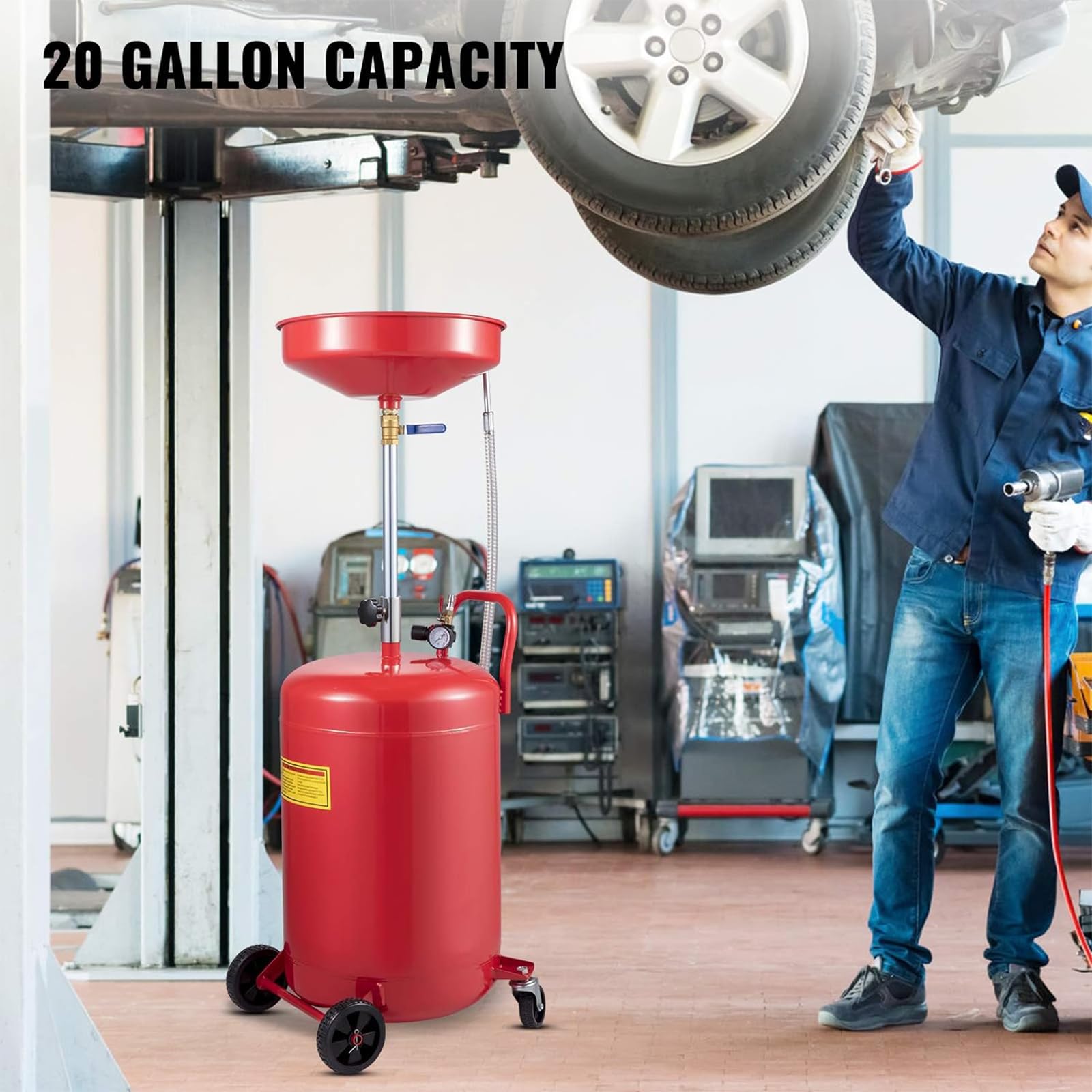 【20 Gallon Capacity】 This oil drain tank has a capacity of 20 gallons and can collect waste oil from 8-10 cars. It features air operated working principle, and this waste oil drain can empty the waste oil from the fuel tank in a short time. Great for draining, transferring, and evacuating oils and fluids.