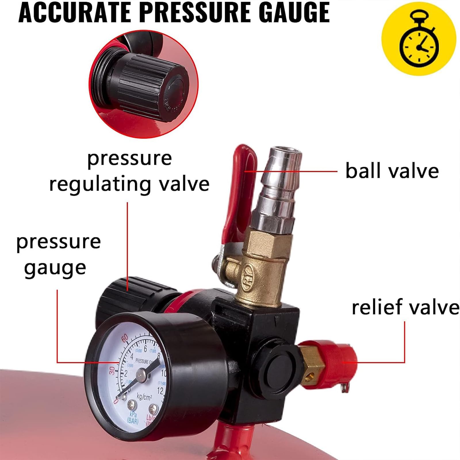 【Well-designed Details: As this type of waste oil drain tank, the pressure can be adjusted through the pressure regulating valve. And the intake air volume can be controlled. The pressure adjustment range is 1-3 MPa, and can be accurately read on the pressure gauge. With the ergonomic handle, our oil drain tank is comfortable to use. Built of premium steel with powder coated surface, the oil drain pan is sturdy and rustproof.