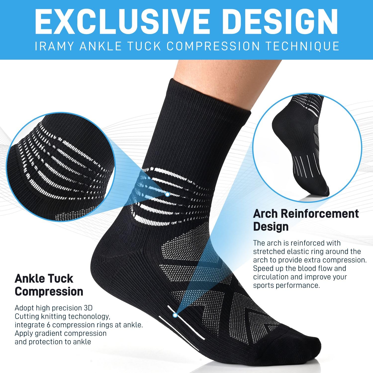 Ankle Tuck Compression: IRAMY Compression Socks combine advanced air knitting technology with 6 targeted compression rings for optimal ankle and arch support. The even pressure around the ankle relieves swelling, reduces muscle fatigue, and alleviates discomfort from plantar fasciitis, helping you stay active and pain-free throughout the day.