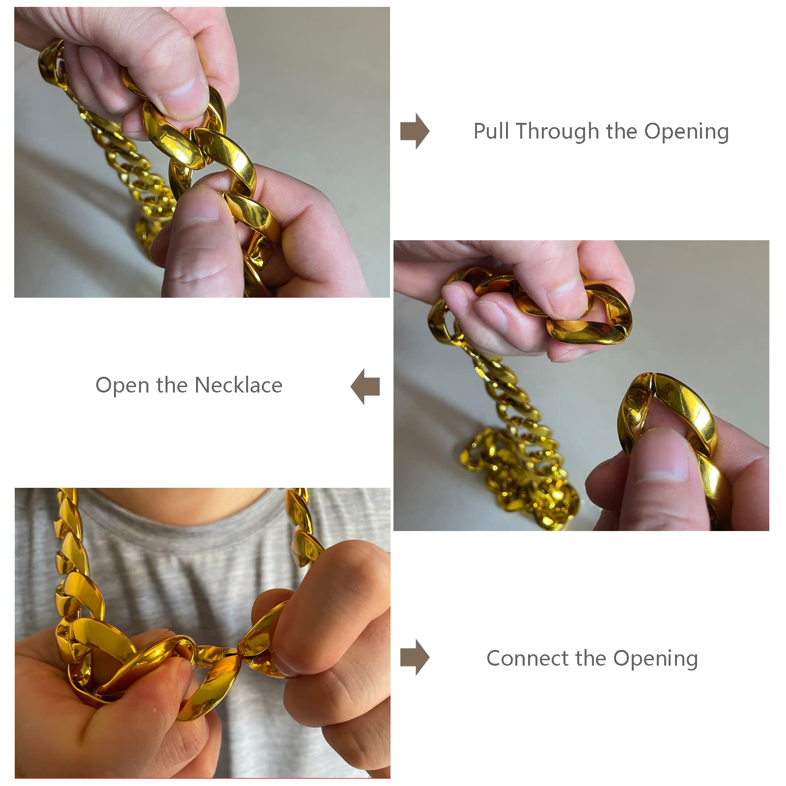 Fake Gold Chain Necklace: Made of plastic, plated with fake gold,lightweight and non-fading, smooth surface for no hurting your skin. Perimeter is 27.5inches/70cm, width 1.37iches/3.5cm, you can open and close the necklace through the chain opening to obtain a whole gold chunky Chain.