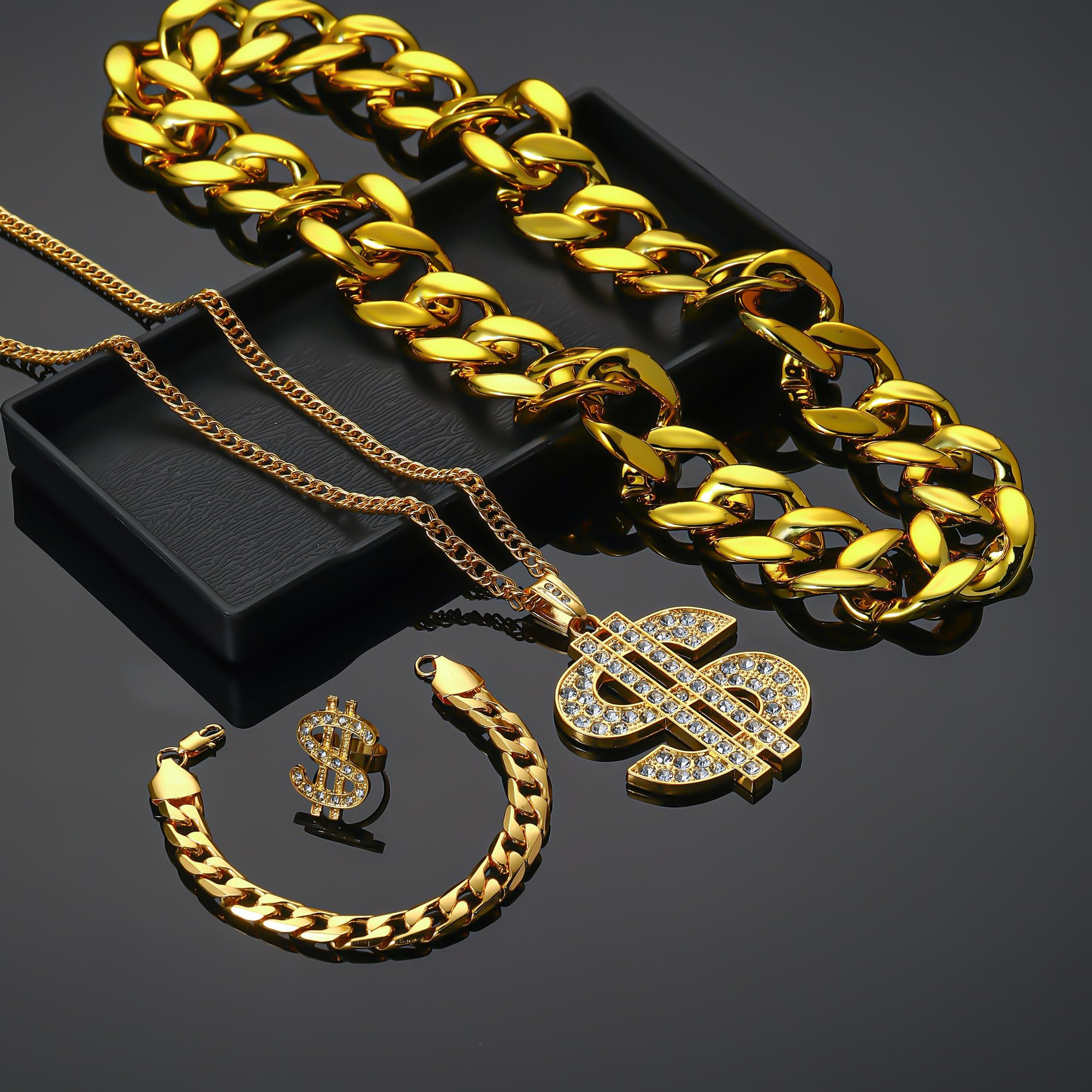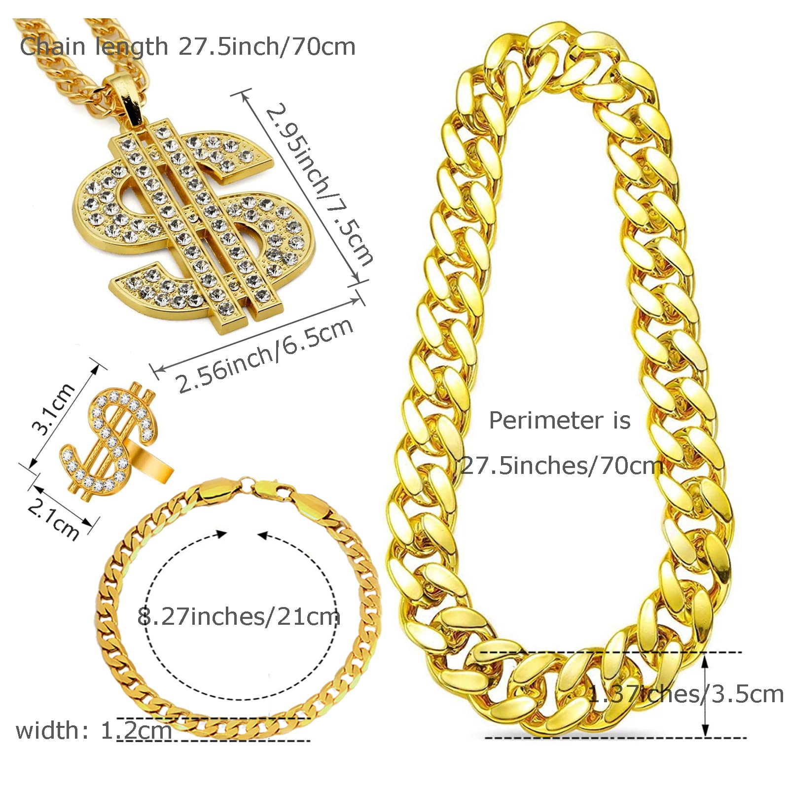 80s 90s Rapper Costumes Outfit: Faux gold jewelry set includes necklace, bracelet and ring, designed for hip hop and costume on the casual, party, prom and bar, also suitable for matching 80s and 90s outfit. You can also use it as a gift sent to your friends or family on Halloween, Christmas, birthday...