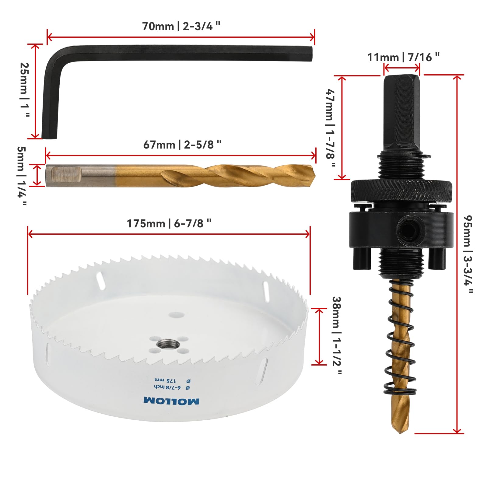 【Dimension】Cutting Dia: 175mm | 6-7/8";Shank Dia: 11mm | 7/16",BI hole saw over 51mm require stronger shank to ensure more security;Hole Saw Depth : 38mm | 1-1/2".Adopting raw materials of Japanese brand sawbands.