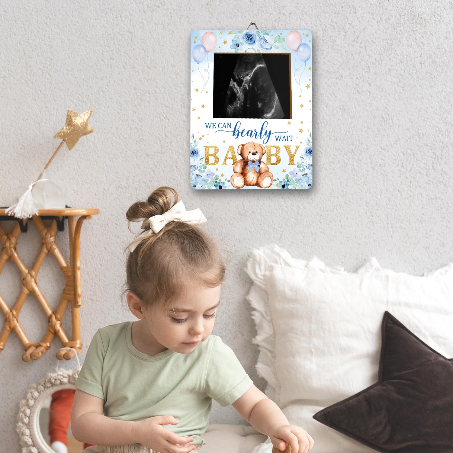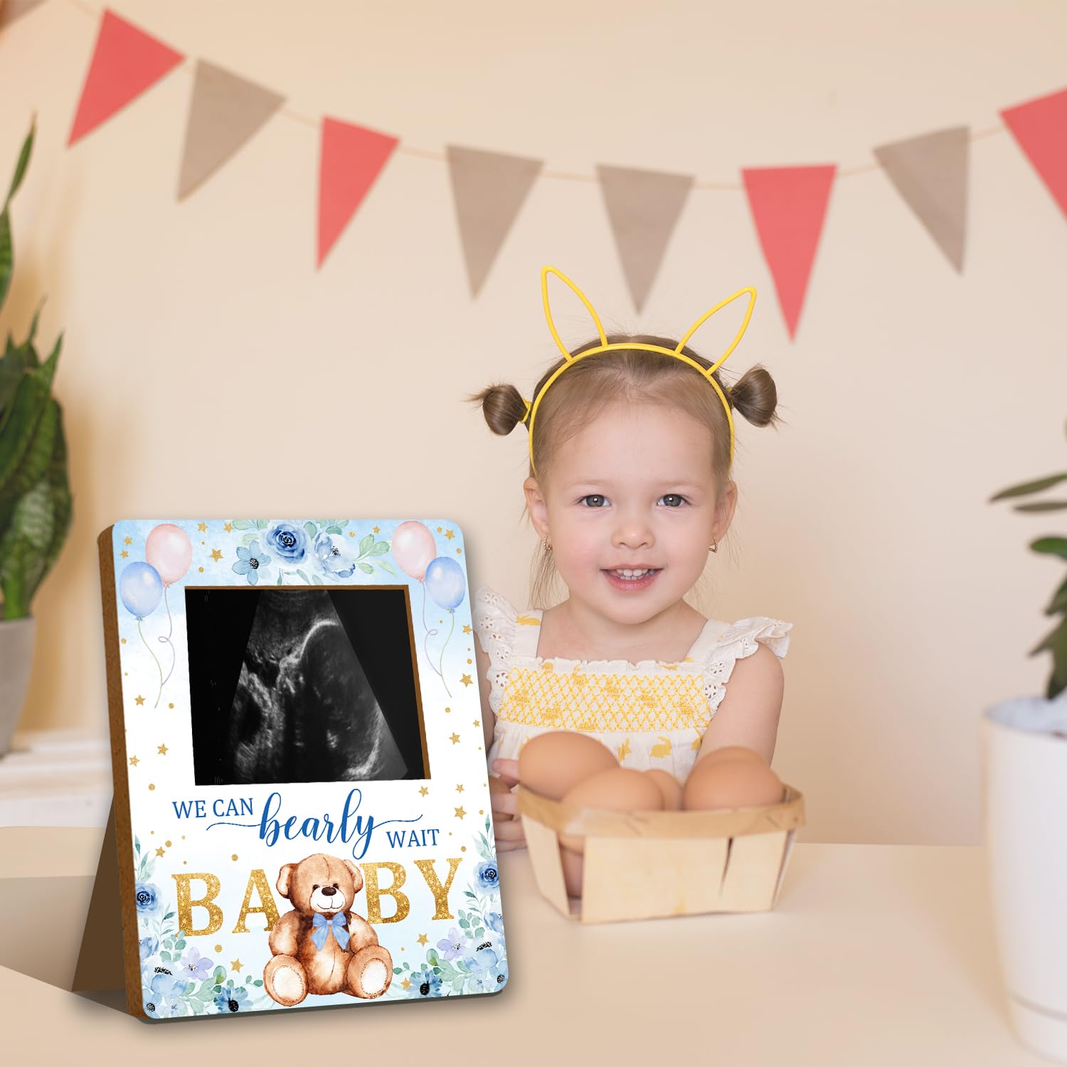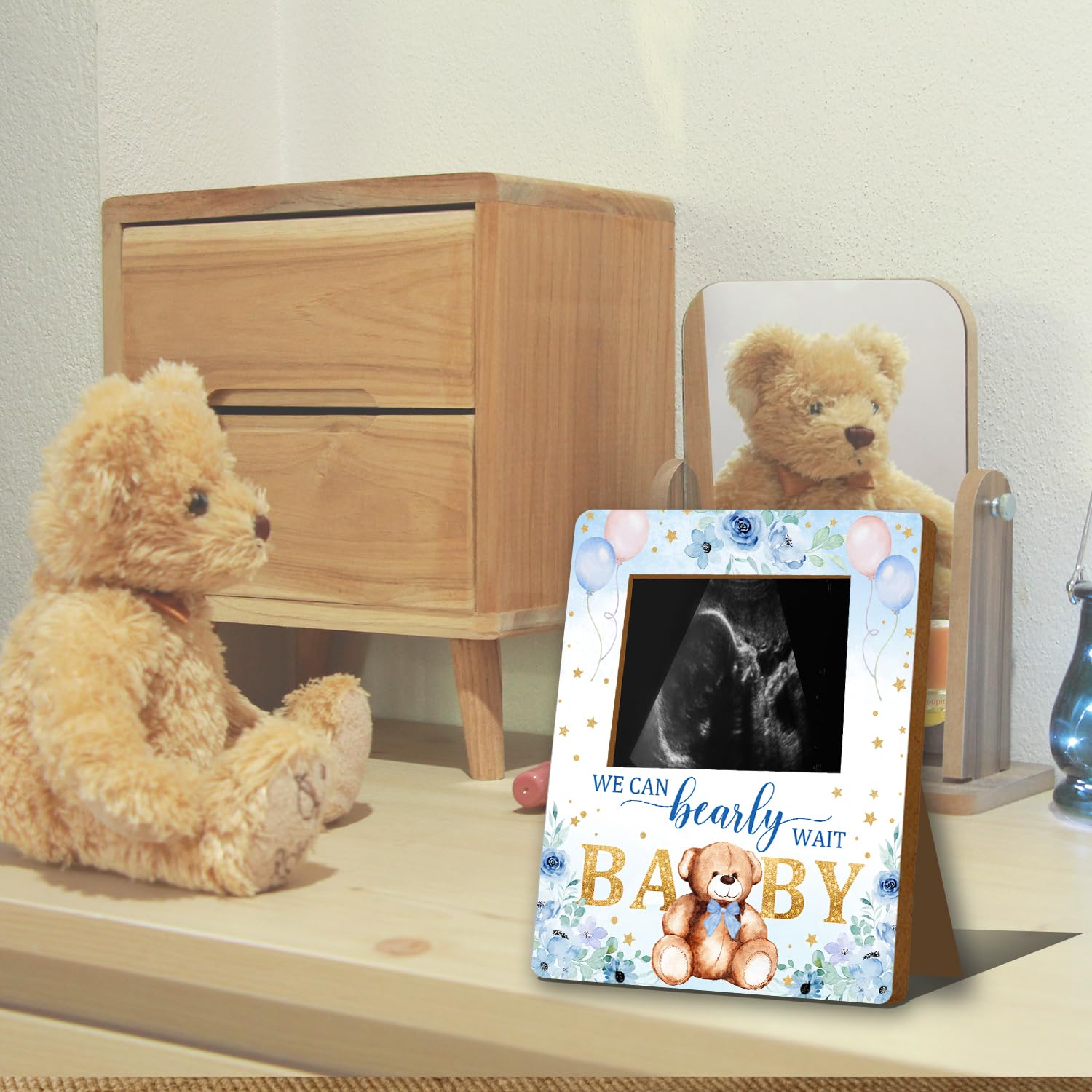 Material: This Bear baby ultrasound photo frame for expectant parents, has clear printing and is made of wood material. It is sturdy and not easily damaged and can be used by you for a long time.