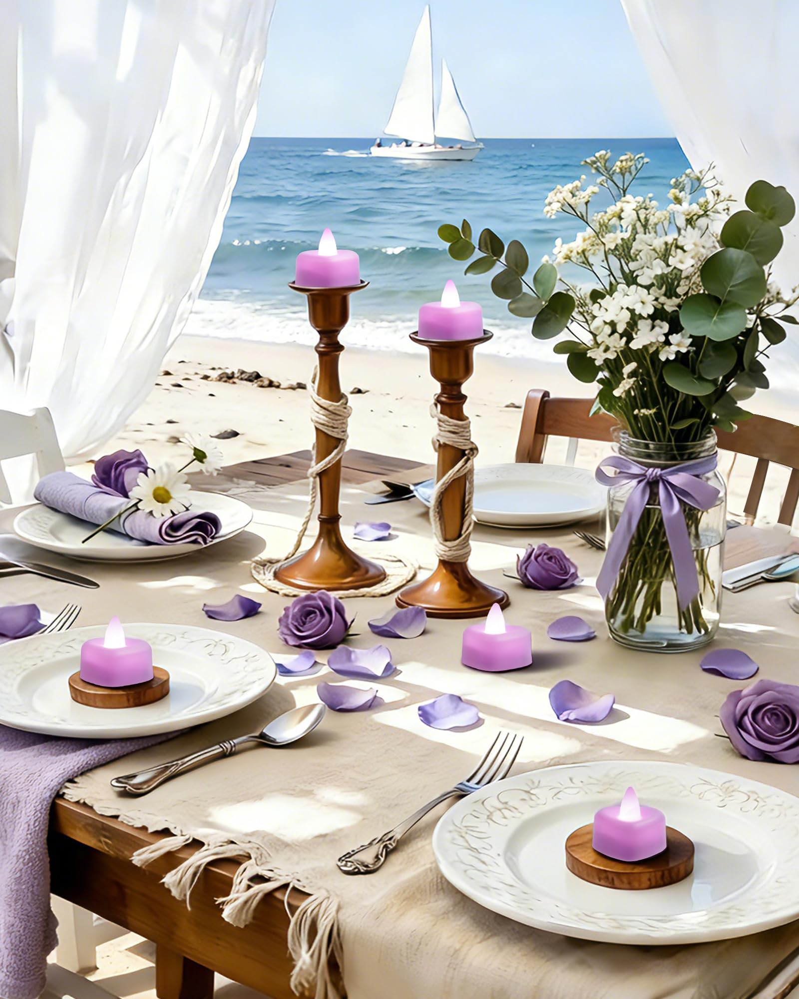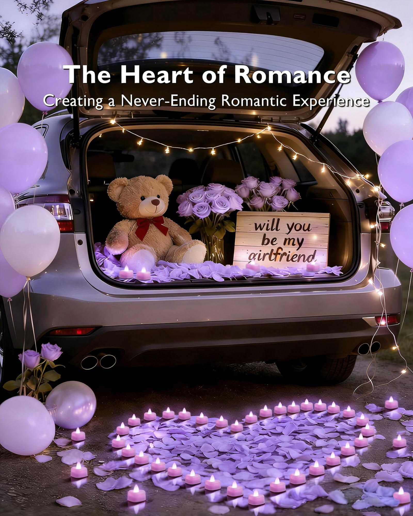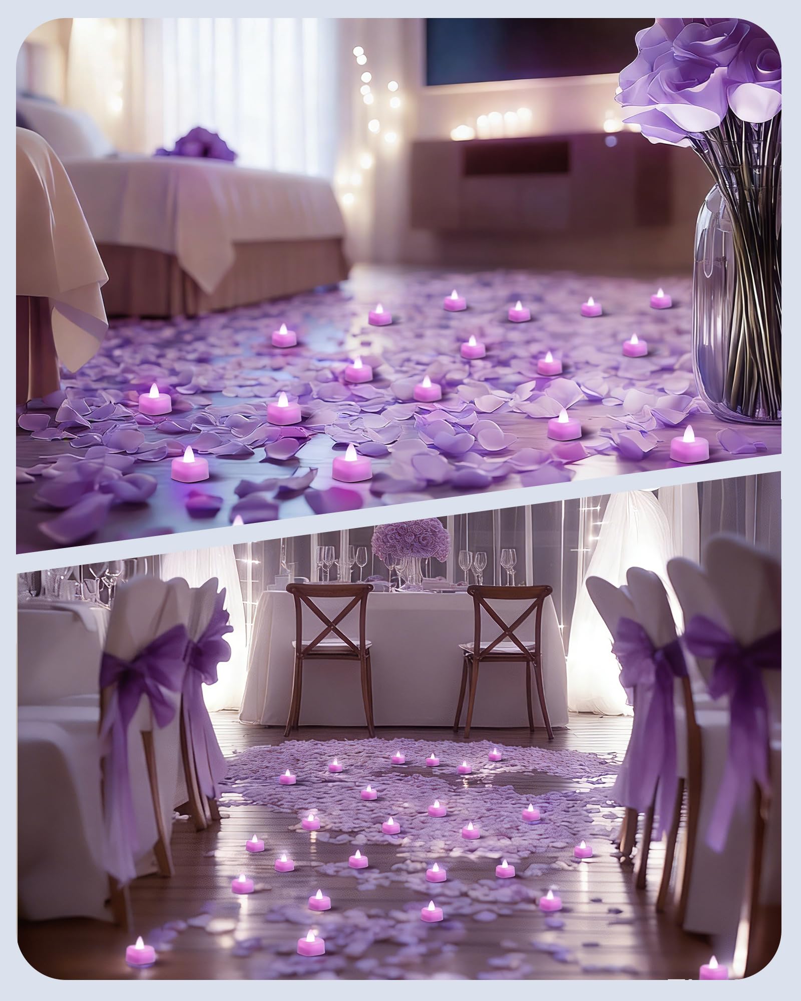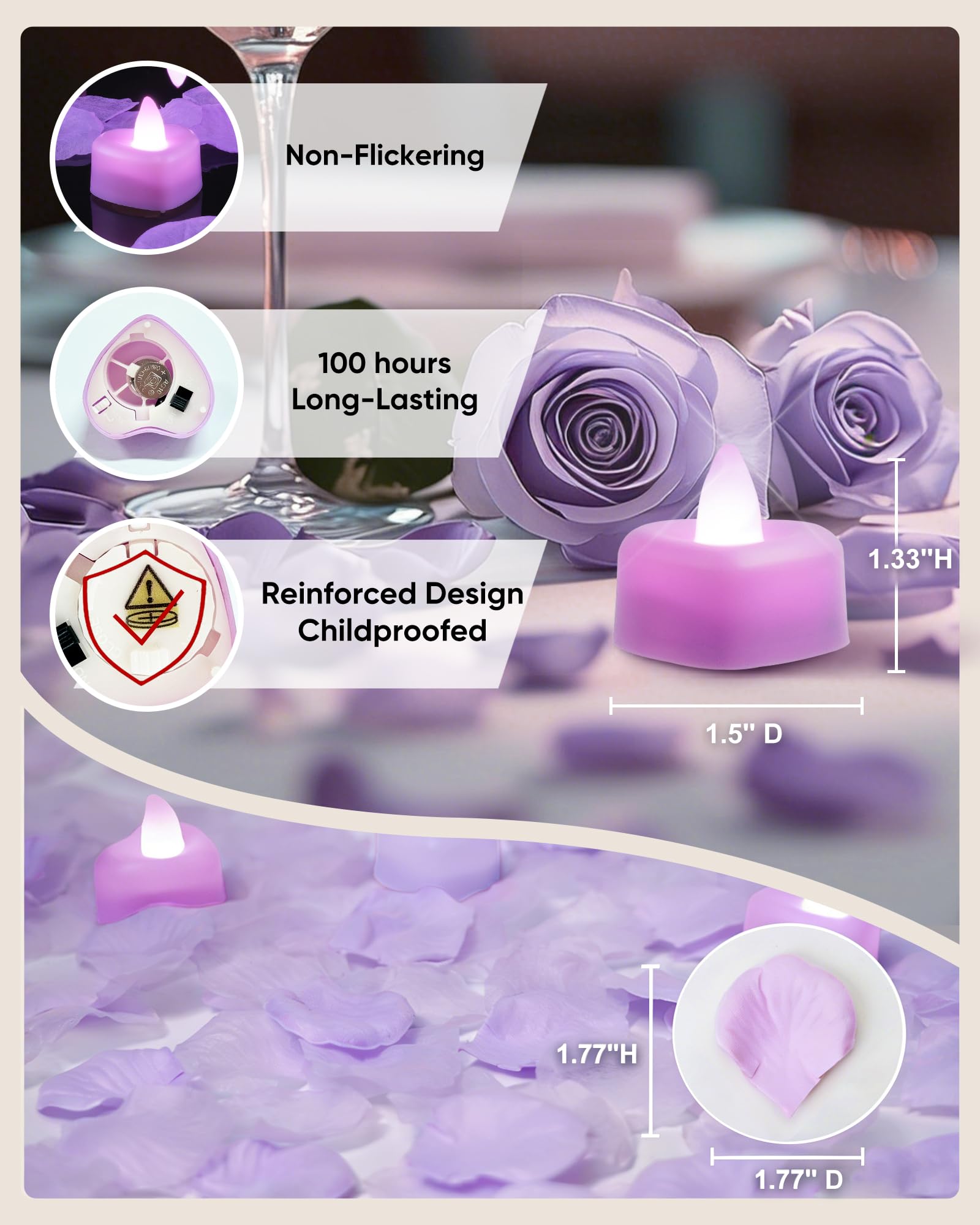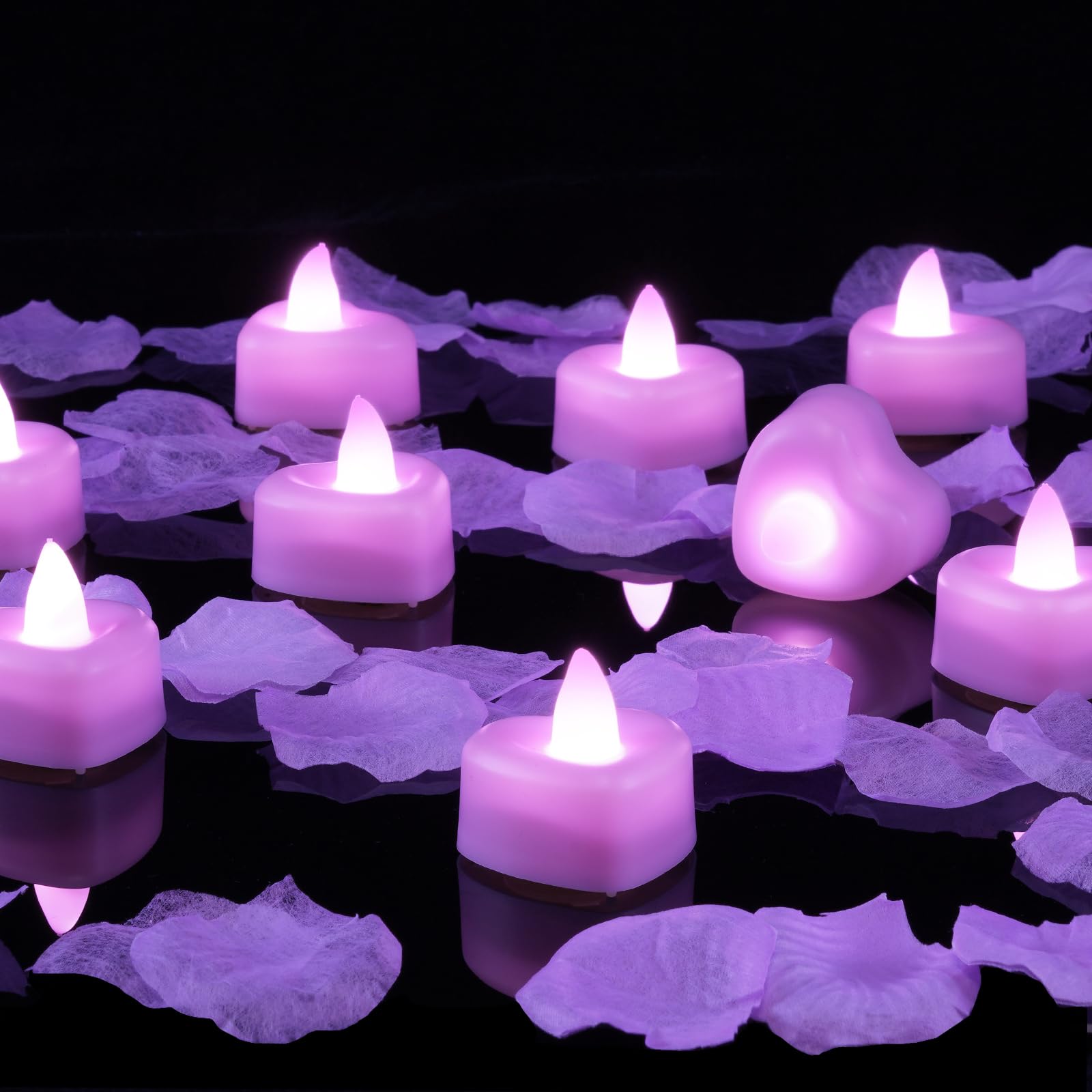 Light Purple Heart-Shaped LED Tea Candles: These enchanting electronic tea lights emit a warm, bright purple glow, effortlessly transforming any space into a romantic haven without the worry of flames or mess