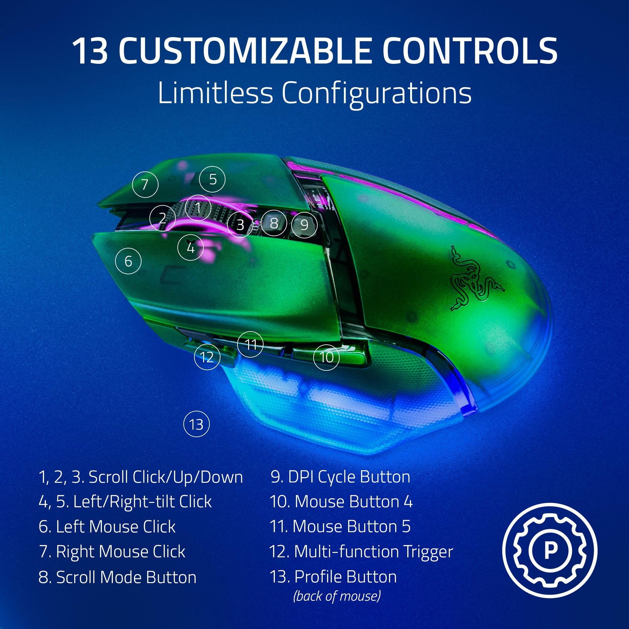Product Overview Set your immersion to maximum with the Razer Basilisk V3 Pro 35K—a wireless ergonomic RGB gaming mouse that’s more advanced and customizable than ever. Razer HyperScroll Tilt Wheel – The most advanced 4-way scroll wheel, with 3 unique scroll modes: Tactile Cycling, Free-Spin Scrolling, and Smart-Reel Mode. Adjustable Scroll Tension & Acceleration – Access new customizable scroll options on the new Synapse 4, with 5 levels of scroll tension and 5 multiplier levels of scroll acceleration. Razer Focus Pro 35K Optical Sensor Gen-2 – The most advanced and precise sensor with 1-DPI step adjustments and 99.8% resolution accuracy. Intelligent Features – With Smart Tracking, the sensor can automatically detect and adjust its tracking algorithm to match the surface, maintaining consistent lift-off distance for greater control and accuracy. Enabling Motion Sync allows the sensor to sync its signals to the exact intervals your PC extracts information, ensuring you get the most current updates of your mouse position for more consistent tracking. Tri-Connectivity Mode – Connect the mouse via Razer HyperSpeed Wireless (2.4 GHz), Bluetooth or Wired USB C (for continued usage while charging). Enjoy up to 140 hours on 2.4 GHz, or 210 hours on Bluetooth. Razer Hypershift – Assign a secondary function to each of the mouse’s 13 controls via Synapse and effectively double your command. Instantly toggle between functions with a touch of a button.